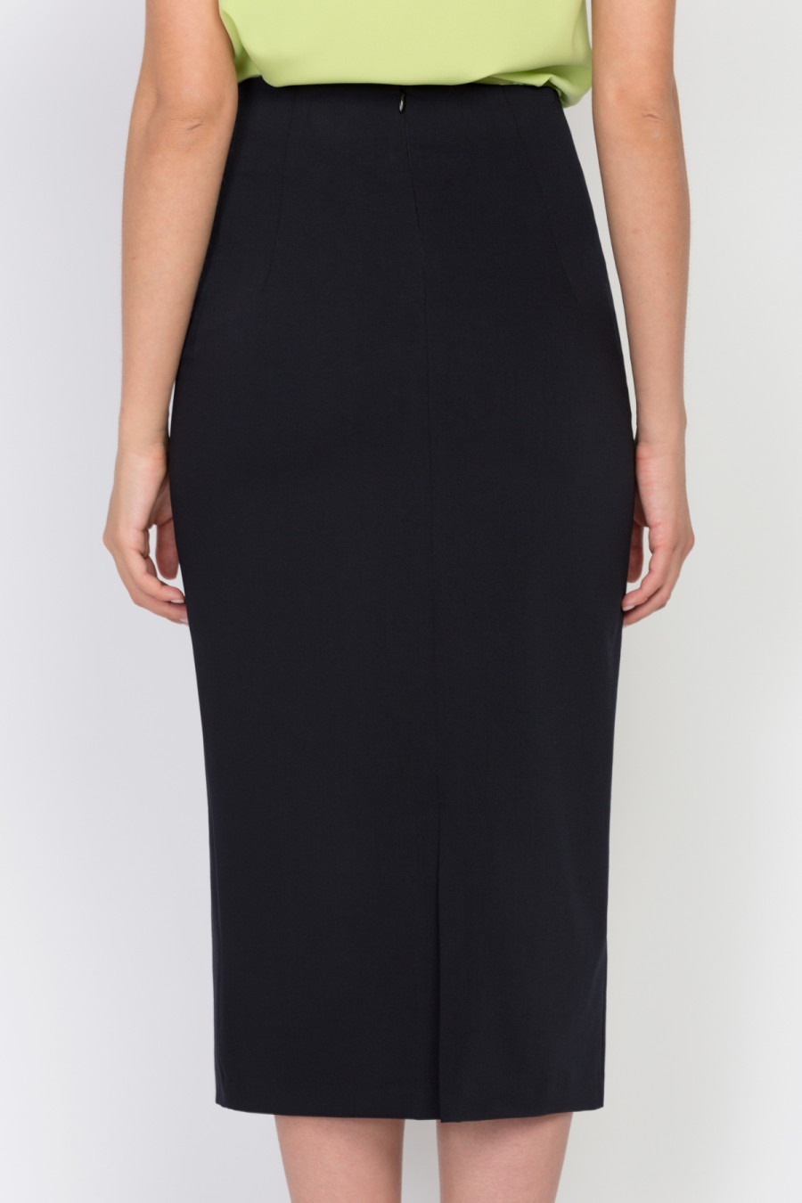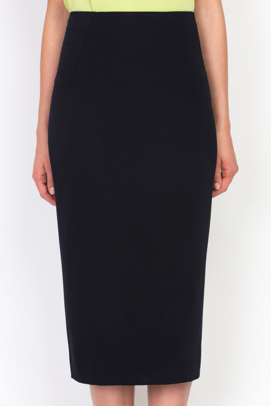 Облегающая юбка-миди из ткани средней плотности с легким эффектом глянца темно-синего цвета. Сзади застежка-молния и разрез. Есть подкладка из полиэстера. Юбка идеально сидит по фигуре, визуально вытягивает силуэт и стройнит. Отличный вариант для офиса. Рост фотомодели 172 см. Длина: 78 см.