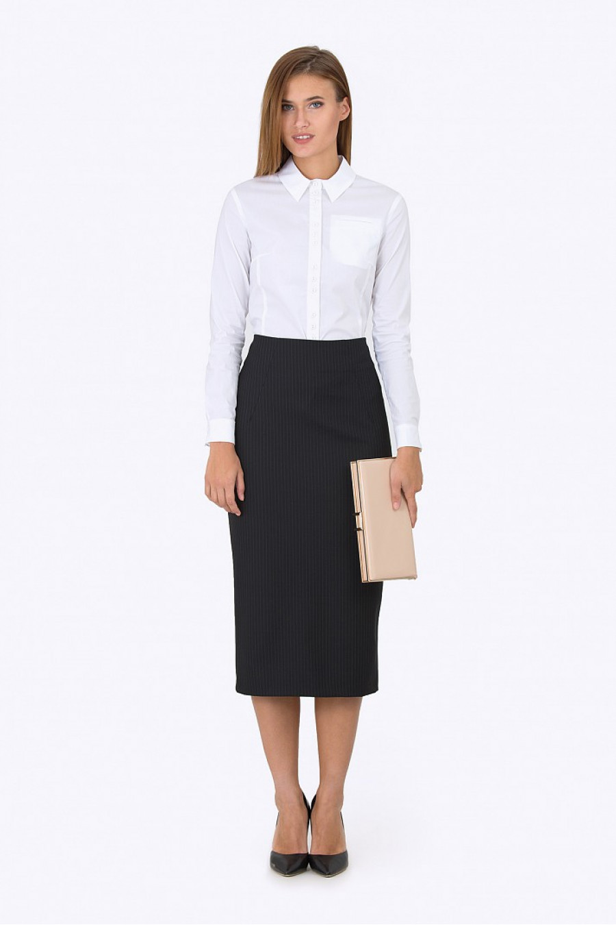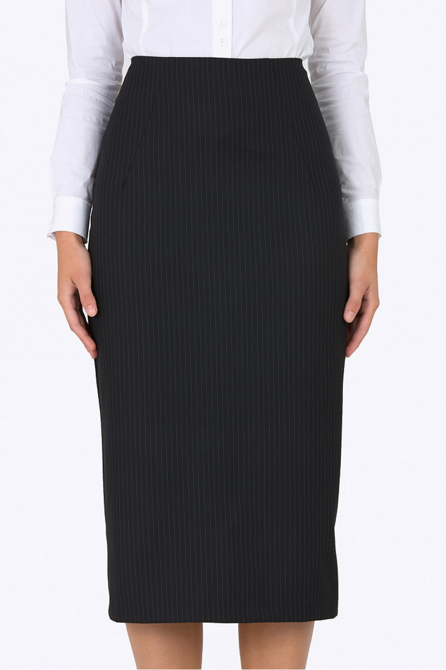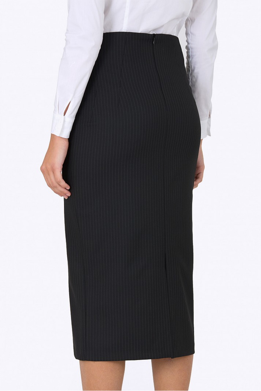 Облегающая юбка-миди из ткани черного цвета в серую полоску. Сзади застежка-молния и элегантный разрез. Есть подкладка из полиэстера. Юбка идеально сидит по фигуре, визуально вытягивает силуэт и стройнит. Отличный вариант для офиса.