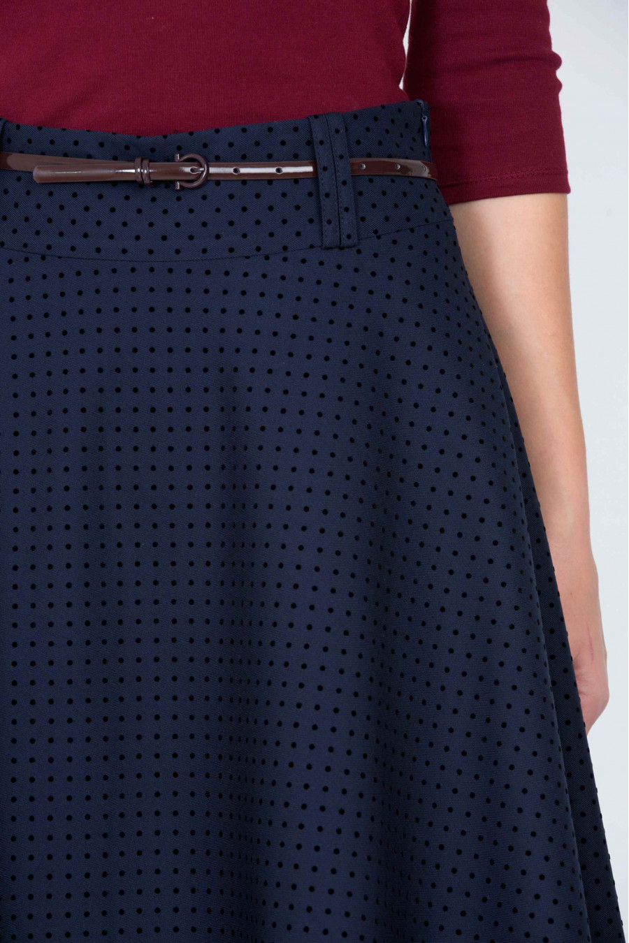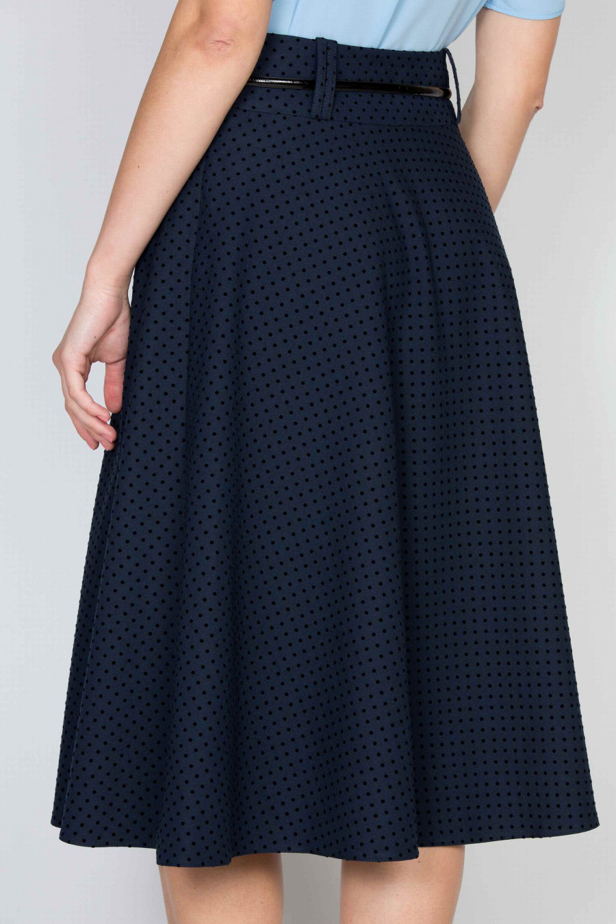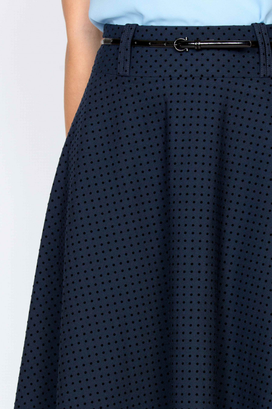Очаровательная расклешенная юбка. Ткань мягкая, фактурная с объемным темно-синим принтом. На поясе есть шлевки, ремешок продается отдельно. Без подкладки. Юбка поможет создать нежный, романтичный образ, хорошо смотрится с классическими лодочками и однотонными рубашками. Рост фотомодели 175 см. Длина: 73 см.