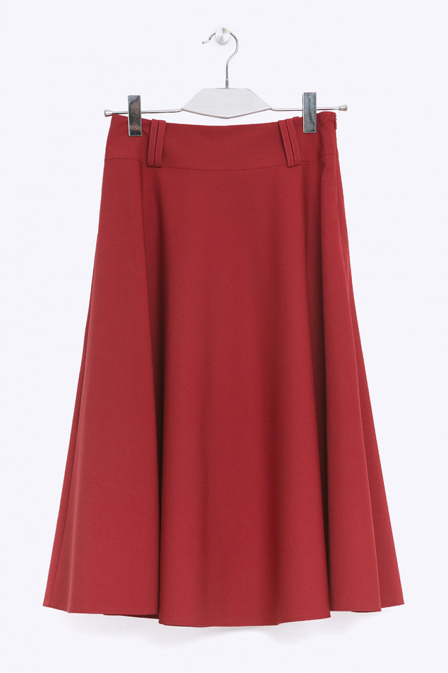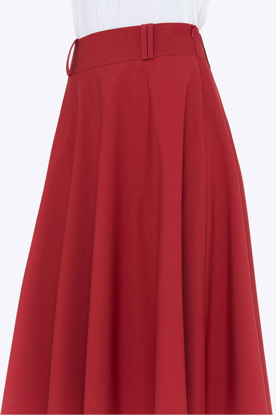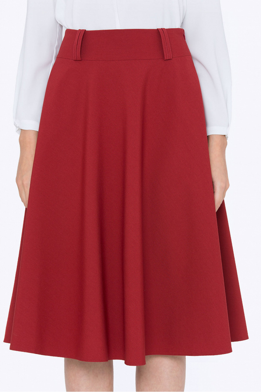 Расклешенная юбка миди. Ткань мягкая, красного цвета. На поясе шлевки. Есть подкладка. Юбка поможет создать нежный, романтичный образ, хорошо смотрится с классическими лодочками и однотонными блузками. Рост фотомодели 178 см.