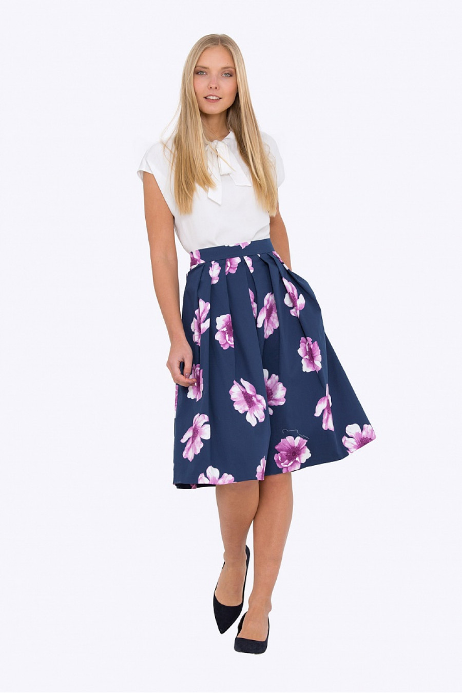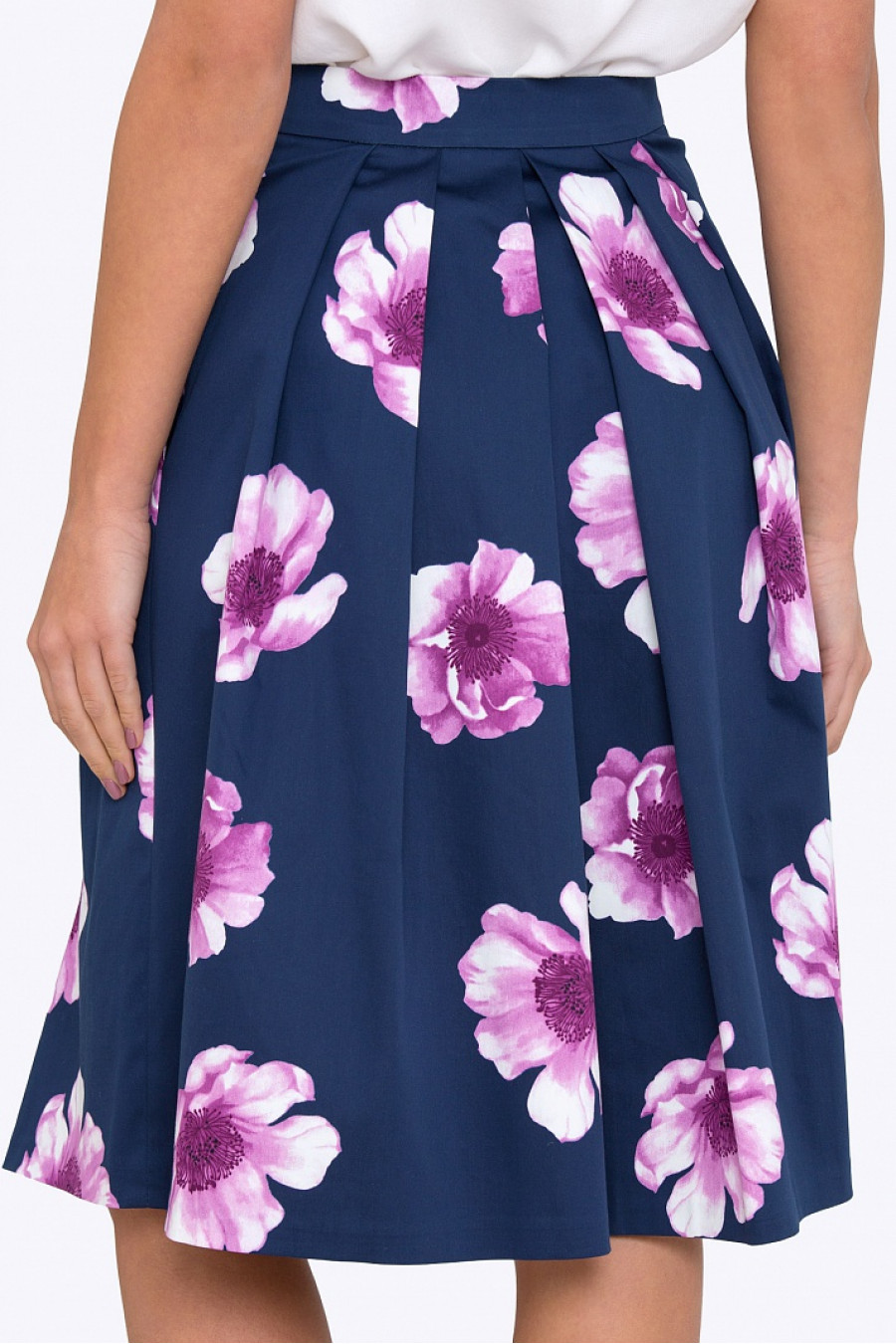 Расклешенная юбка на поясе со встречными складками. Ткань эластичная, натуральный хлопок с добавлением лайкры. По бокам в швах удобные карманы, с левого бока застежка-молния. Юбка без подкладки, не просвечивает, хорошо держит форму. Отличная модель для весенне-летнего сезона.