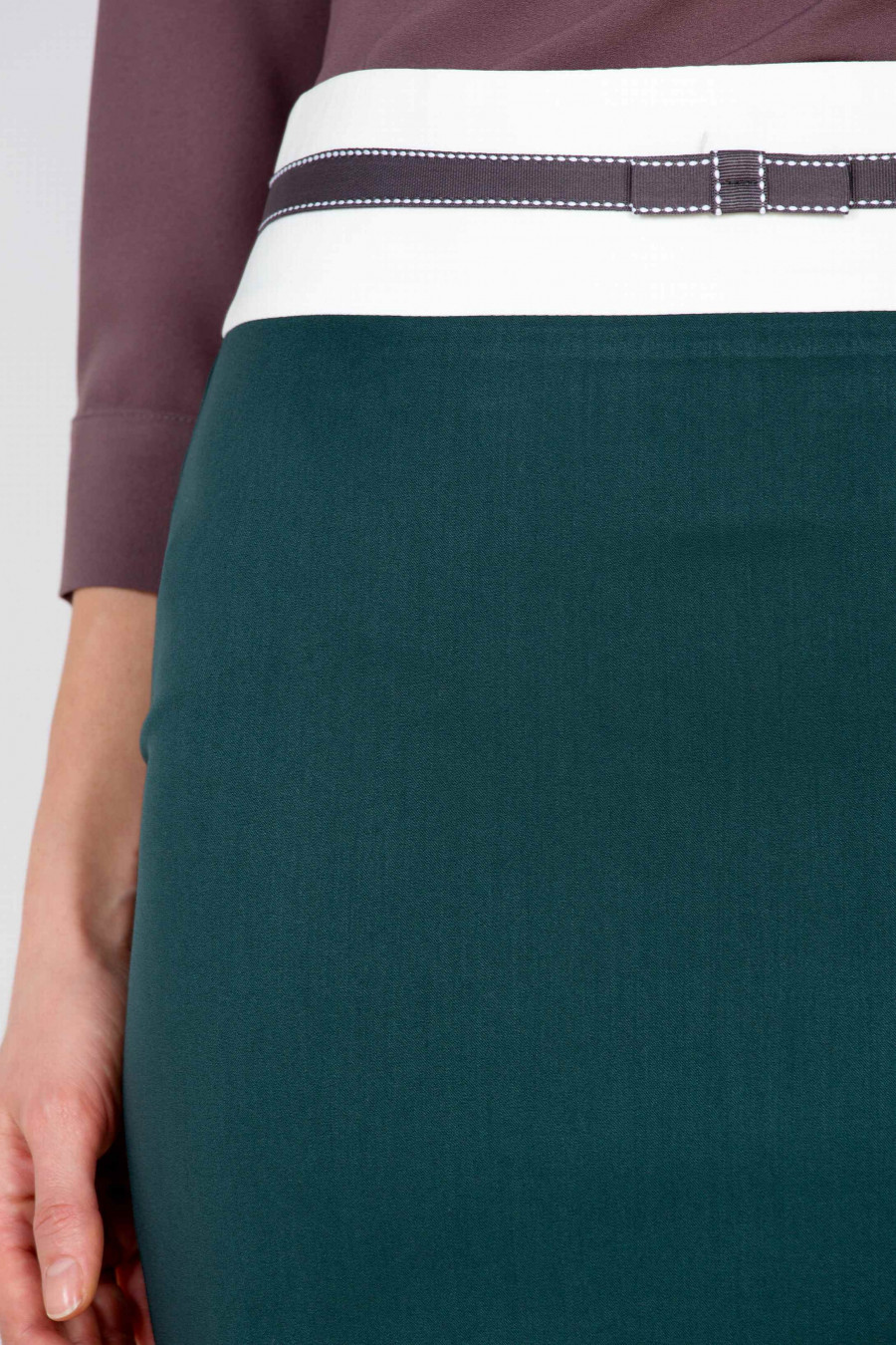 Классическая юбка-карандаш темно-зеленого цвета на белой кокетке, украшенной серой репсовой лентой с кокетливым бантом по центру. Ткань средней плотности, очень приятная на ощупь. Сзади небольшой разрез на подоле и застежка-молния. Есть подклад. Благодаря легкой эластичности ткани, юбка идеально обтягивает и подчеркивает привлекательность фигуры. Образ на фотографии дополняет блузка b 2127/kristof. Рост фотомодели 170 см. Длина: 53 см.