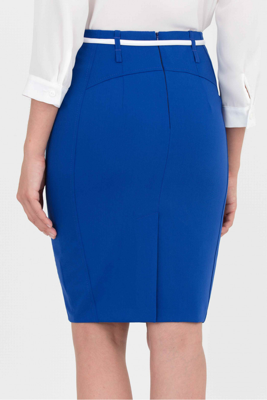 Элегантная юбка-карандаш цвета электрик. Сзади застежка-молния и аккуратная шлица. Есть подкладка из полиэстера. На поясе - шлевки, ремешок продается отдельно. Хорошая модель для офиса. Благодаря вертикальным рельефам юбка визуально удлиняет силуэт и стройнит. Рост фотомодели 172 см. Длина: 55 см.