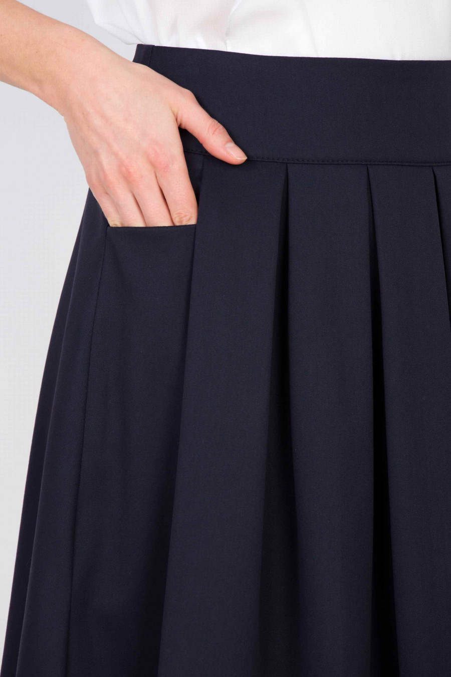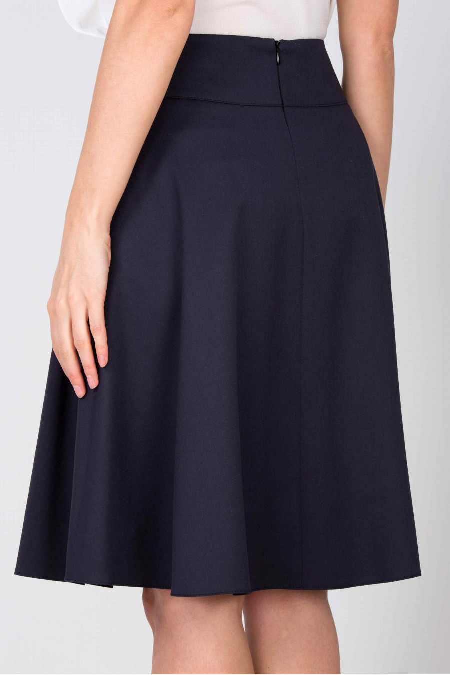 Расклешенная юбка на кокетке темно-синего цвета. Ткань средней плотности, очень приятная на ощупь. Спереди встречные складки и узкие кармашки. Сзади застежка-молния. Есть подклад. Отлично подойдет как для офиса, так и для вечеринки с друзьями. Рост фотомодели 170 см. Длина: 59 см.