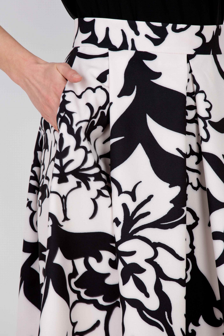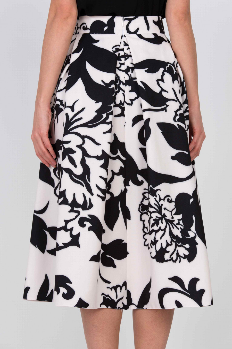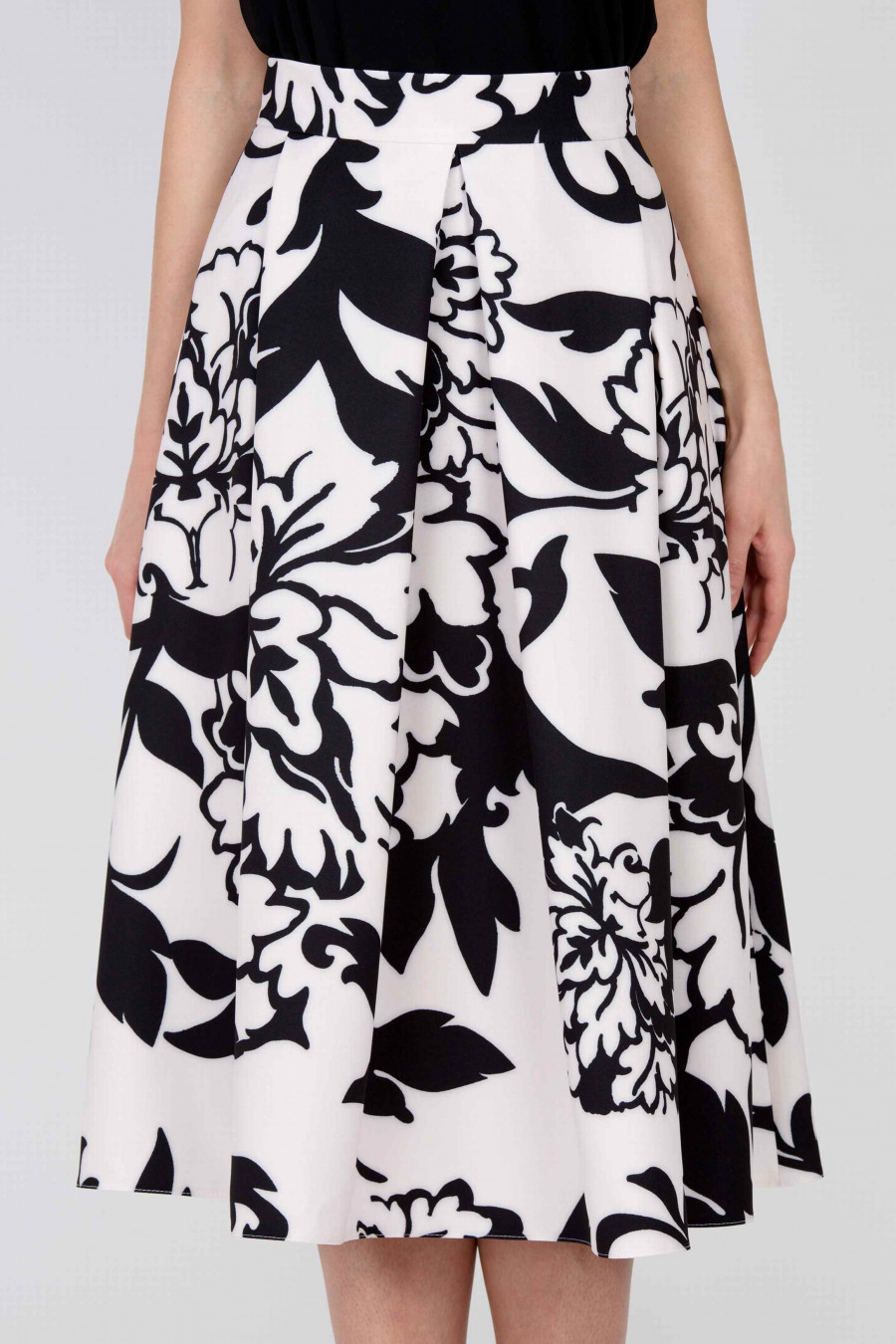 Расклешенная юбка на поясе нежного светлого оттенка с черным цветочным принтом. Ткань пластичная средней плотности. Без подклада. Спереди и сзади глубокие складки. Застежка-молния сзади. Благодаря длине ниже колена, расклешенному силуэту и мягким складкам поможет создать образ в стиле Одри Хепберн. Рост фотомодели 170 см. Длина: 77 см.