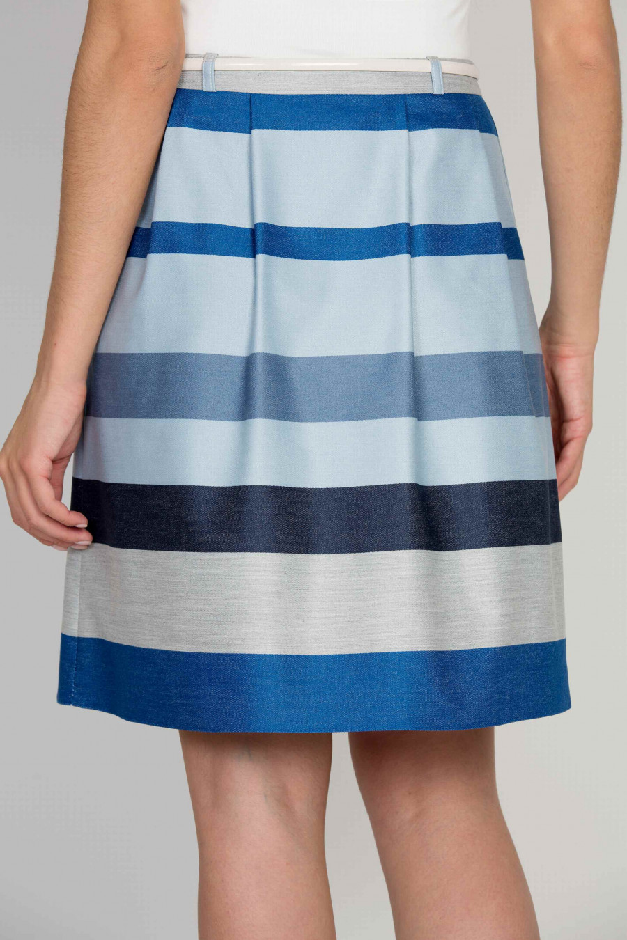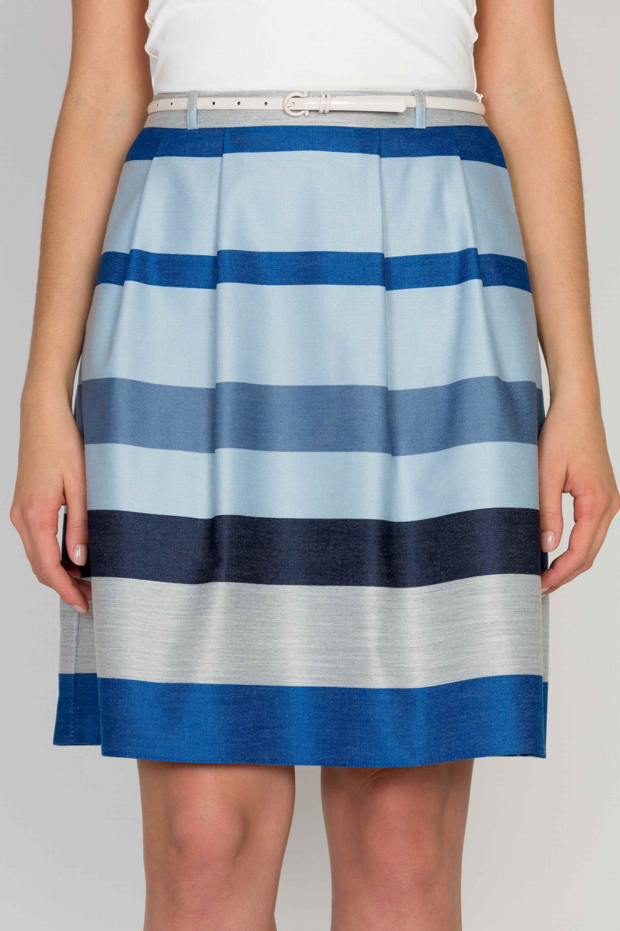 Расклешенная юбка в полоску серо-синих оттенков. Ткань мягкая, средней плотности, очень приятная к телу. Застежка-молния на левом боку. На поясе есть шлевки. Ремень продается отдельно. Благодаря легким складкам и отсутствию подклада, позволит создать игривый весенний образ.