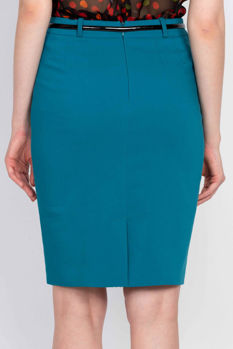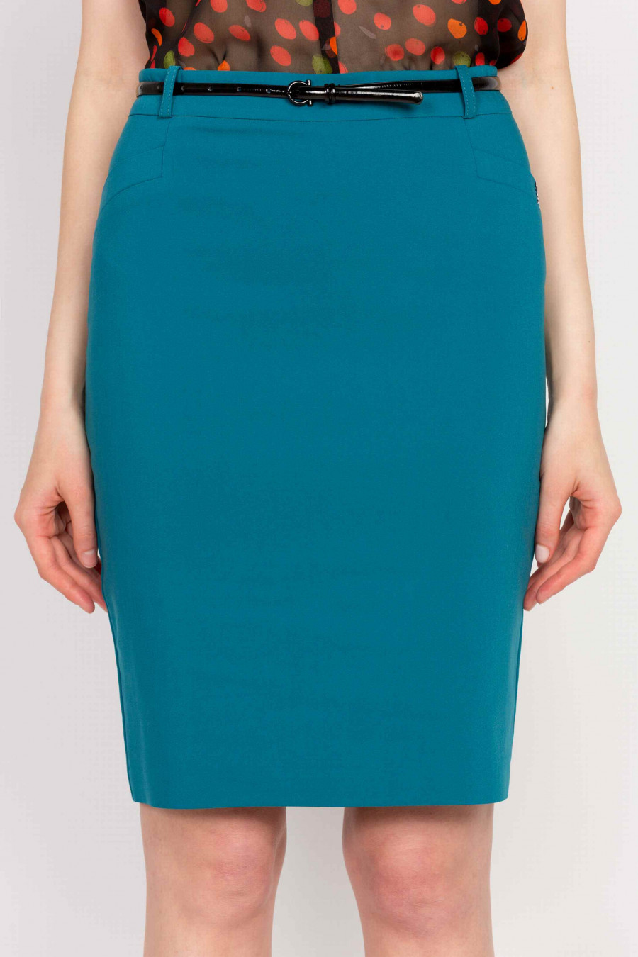 Классическая юбка-карандаш из натурального хлопка с добавлением лайкры. Ткань мягкая, приятная на ощупь цвета морской волны. На поясе есть шлевки, ремешок продается отдельно. Спереди юбка оформлена листочками, сзади есть небольшая шлица и застежка-молния. Есть легкая хлопковая подкладка. Хороший вариант для офиса.