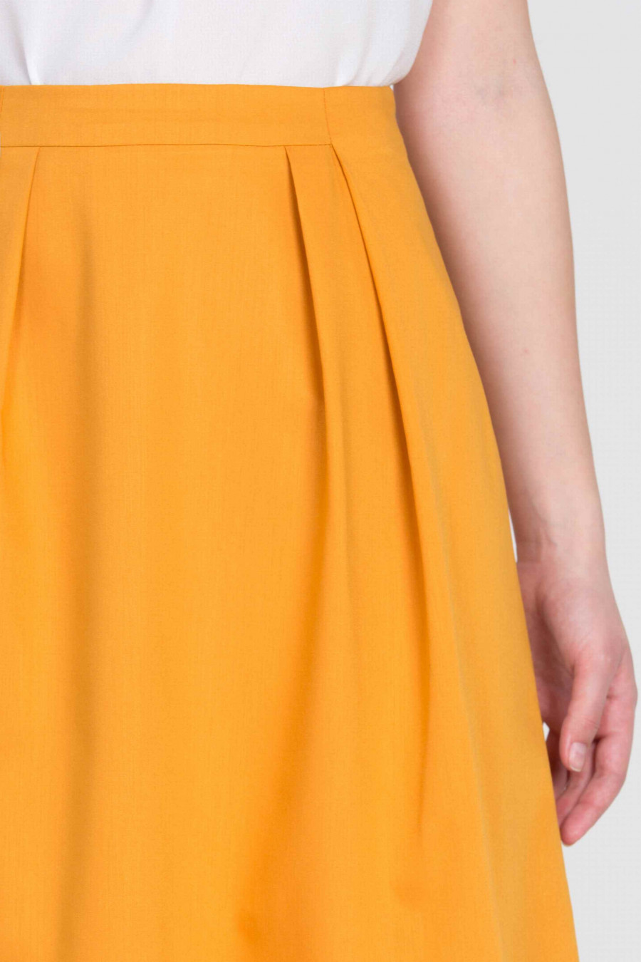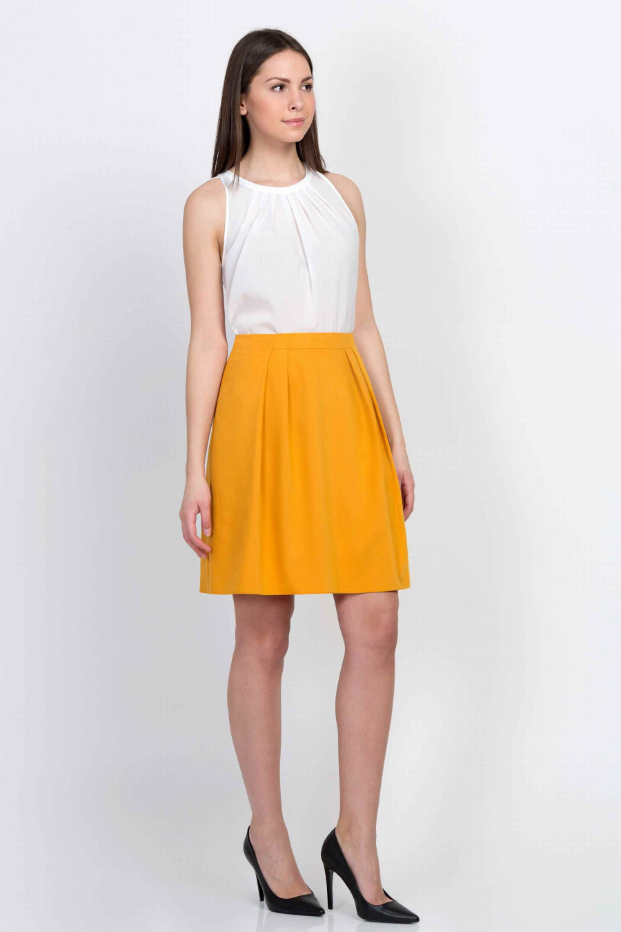 Слегка расклешенная юбка из приятной на ощупь ткани горчичного цвета. Спереди по бокам есть мягкие складки, сзади - рельефы. Застежка-молния с левого бока. Есть подкладка из полиэстера. Юбка хорошо сидит по фигуре, зрительно удлиняет ноги. Отличный вариант на повседневную носку. Образ на фотографии дополняет блузка b 2142-esse Рост фотомодели 175 см. Длина: 53 см.