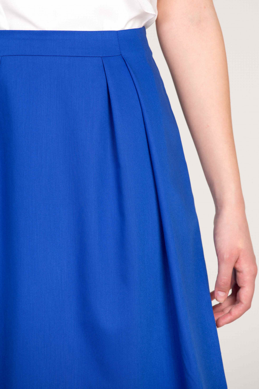 Слегка расклешенная юбка из приятной на ощупь ткани цвета электрик. Спереди по бокам есть мягкие складки, сзади - рельефы. Застежка-молния с левого бока. Есть подкладка из полиэстера. Юбка хорошо сидит по фигуре, зрительно удлиняет ноги. Отличный вариант на повседневную носку.Рост фотомодели 175 см. Длина: 53 см.