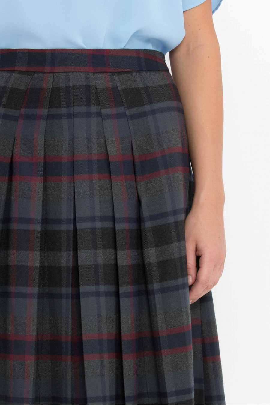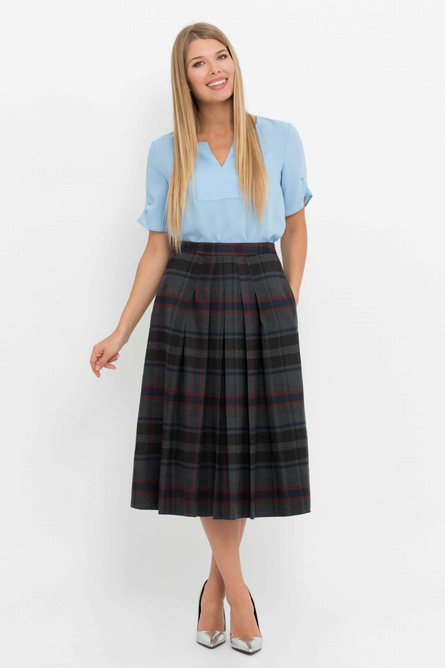 Расклешенная юбка со встречными складками. Ткань мягкая, приятная на ощупь. По бокам функциональные кармашки, есть подкладка из полиэстера. Юбка хорошо держит форму, неприхотливая в носке, отлично подойдет для офиса. Благодаря аккуратным складкам и длине ниже колена формирует фигуру "песочные часы". Рост фотомодели 170 см. Длина: 73 см.