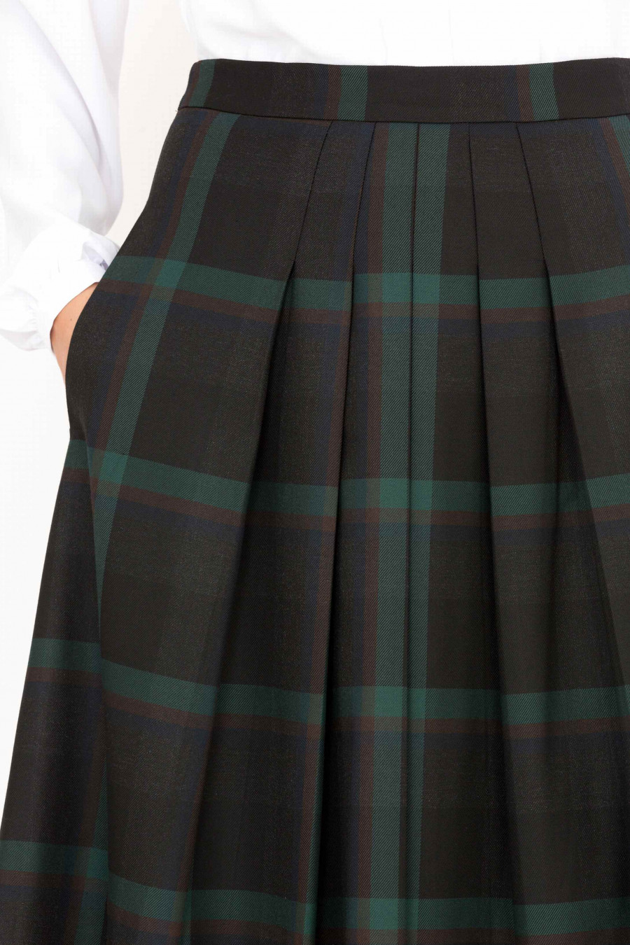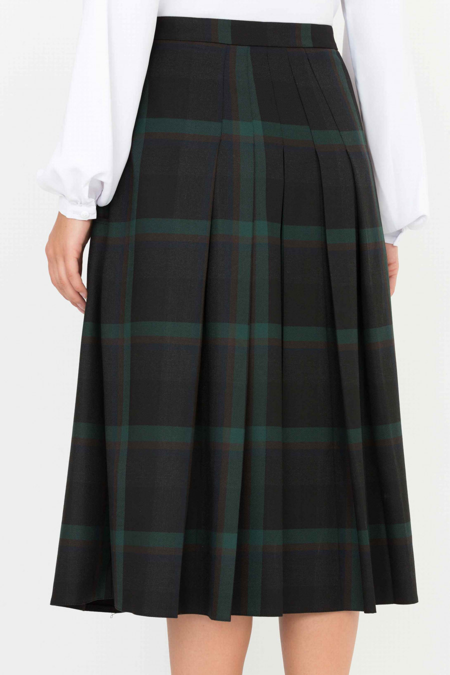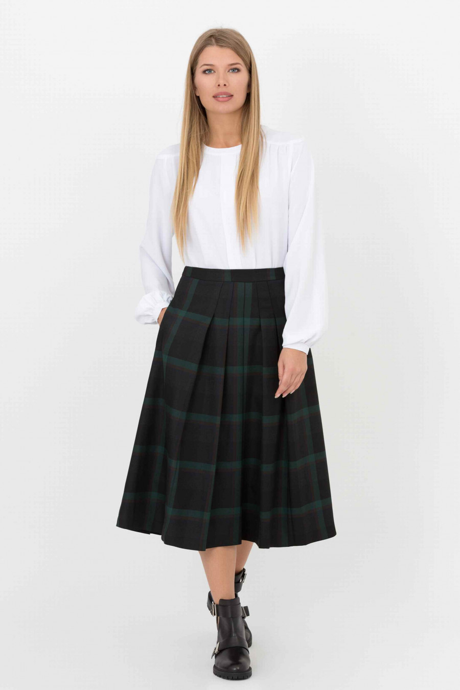 Расклешенная юбка со встречными складками. Ткань мягкая, приятная на ощупь. По бокам функциональные кармашки, есть подкладка из полиэстера. Юбка хорошо держит форму, неприхотливая в носке, отлично подойдет для офиса. Благодаря аккуратным складкам и длине ниже колена формирует фигуру "песочные часы". Образ на фотографии дополняет блузка b 2132-fess.