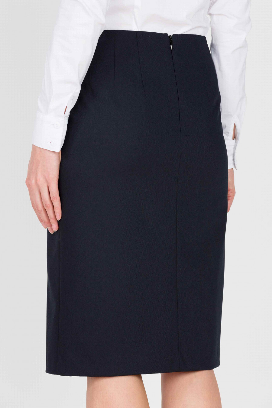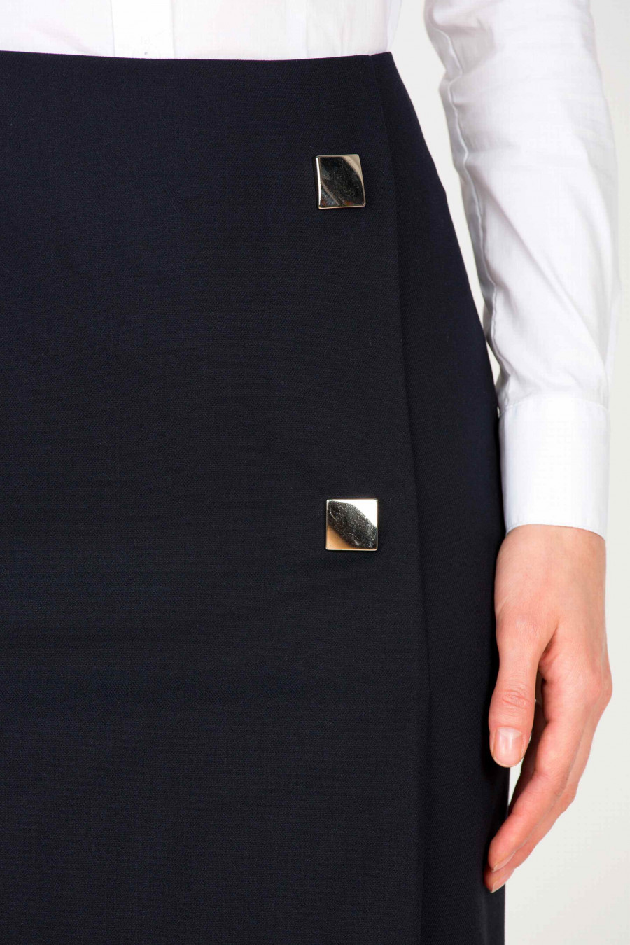 Прямая элегантная юбка из ткани средней плотности. Цвет - черный. Украшена металлическими декоративными элементами. Спереди по левому боку есть шлица, которая создает эффект юбки с запахом. Есть подклад, застежка-молния сзади. Юбка идеально подойдет для офиса. Образ на фотографии дополняет блузка b 2109/dulma. Рост фотомодели 170 см. Длина: 60 см.
