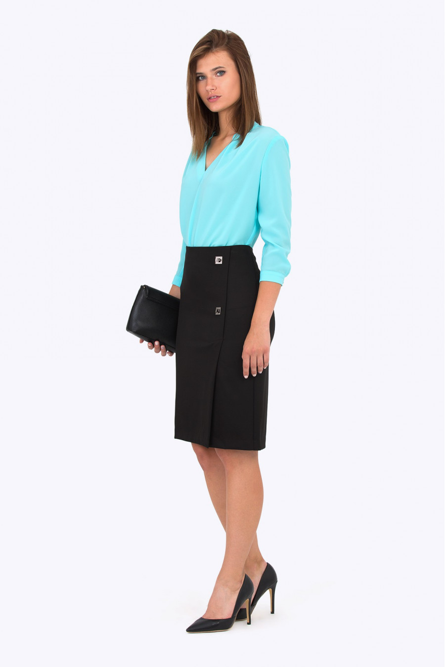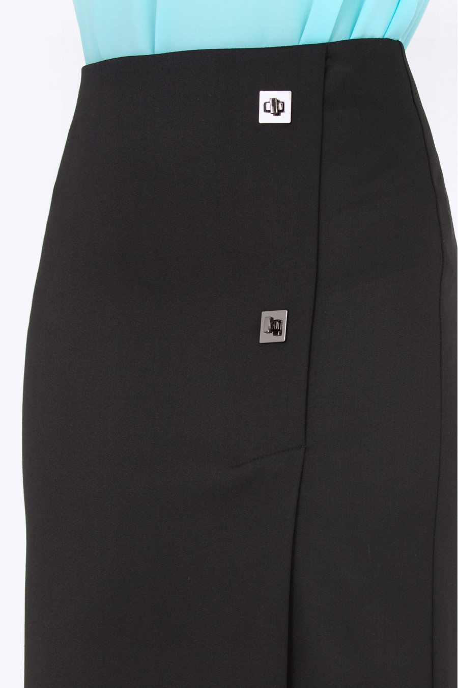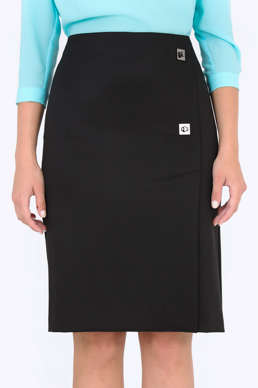 Элегантная юбка классического черного цвета с эффектом запаха. Ткань костюмная, приятная на ощупь. Юбка спереди оформлена аккуратной шлицей и декоративными металлическими заклепками. Есть подкладка из полиэстера. Отличный вариант на повседневную носку, хорошо подойдет для офиса. Рост фотомодели 175 см.