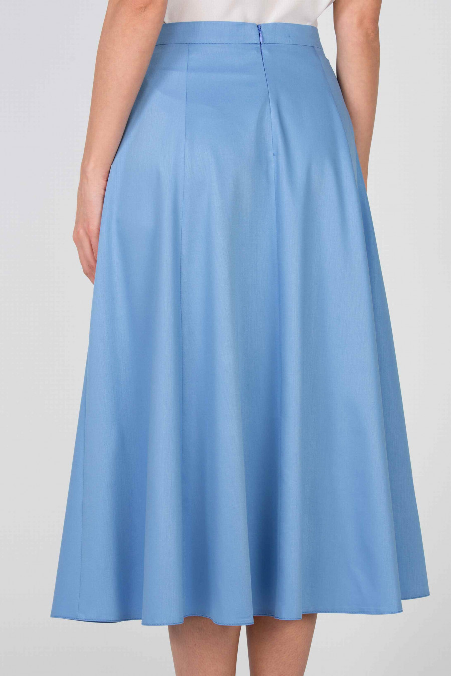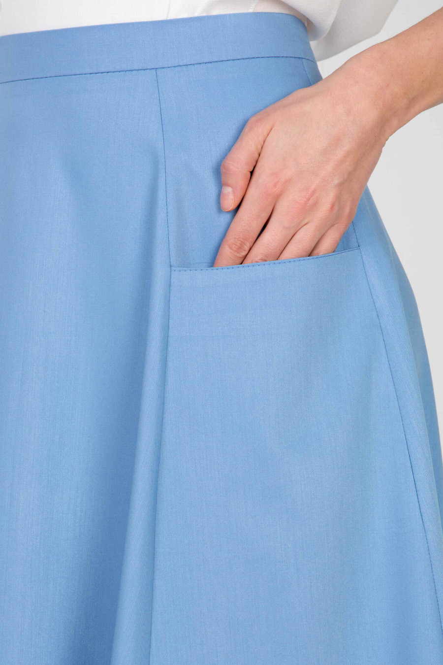 Расклешенная юбка с клиньями ниже колен пастельно-голубого цвета. Ткань легкая, эластичная, с небольшим эффектом глянца, очень приятная к телу. Без подкладки. Спереди украшена элегантными кармашками, сзади застежка-молния. Эта модель отлично подойдет для весенне-летнего сезона и станет отличной основой при создании нежного, романтичного образа. Длина: 78 см.