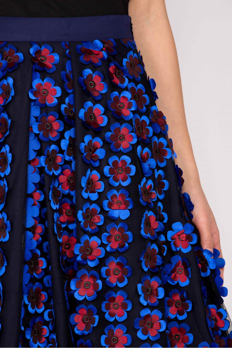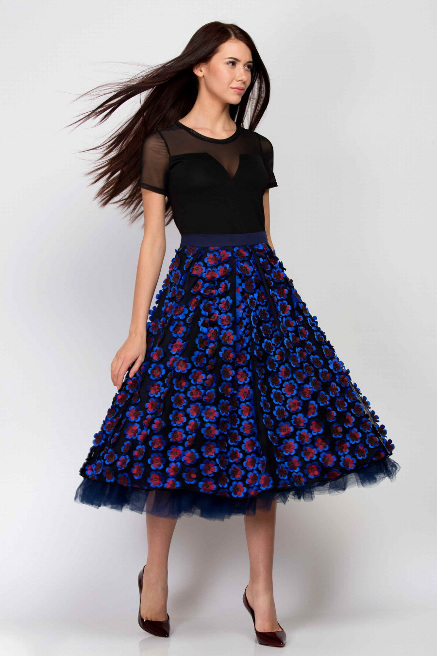 Роскошная юбка из хлопковой подкладки и черной сетки с объемными тканевыми цветами темно-синего и бордового цвета. Благодаря объемному подъюбнику и мягким складкам юбка хорошо держит форму, остается пышной и воздушной. Темно-синий пояс идеально подчеркивает линию талии, сбоку застежка-молния. Модель отлично подойдет для выпускного бала, свадьбы и других торжественных мероприятий. К девушке в такой шикарной юбке будут прикованы все взгляды окружающих.