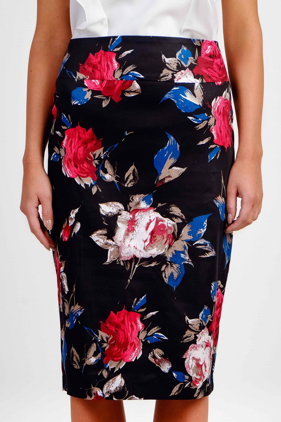 Элегантная юбка-миди на поясе. Ткань - натуральный хлопок, цвет черный с ярким цветочным принтом. Есть легкая хлопчато-бумажная подкладка. Сзади застежка-молния и элегантная шлица. Хорошо сочетается с однотонными блузками. Подойдет как для офиса, так и для торжественного мероприятия. Рост фотомодели 170 см.