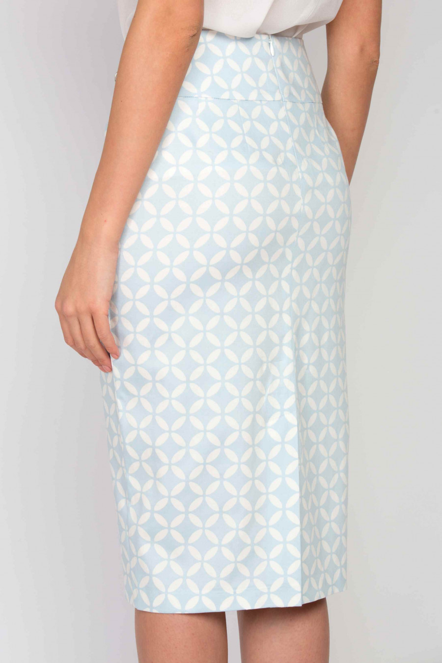 Элегантная юбка-миди на поясе. Ткань на основе хлопка, приятная к телу, нежно-голубого цвета с белым принтом. Без подкладки. Сзади застежка-молния и элегантная шлица. Хорошо сочетается с однотонными блузками. Подойдет как для офиса, так и для торжественного мероприятия.