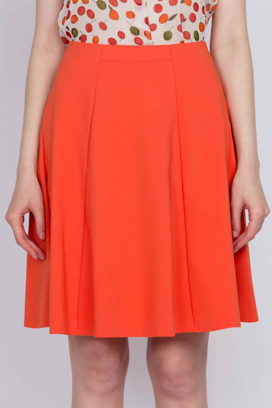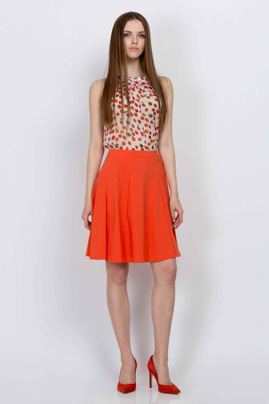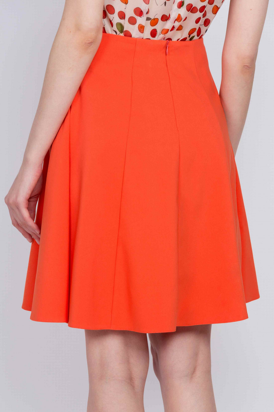 Легкая расклешенная юбка из натурального хлопка с добавлением лайкры. Ткань мягкая, приятная на ощупь морковно-оранжевого цвета. Без подклада, сзади застежка-молния. Юбка отлично подойдет для весенне-летнего сезона. Поможет создать легкий озорной образ и привлечь мужское внимание.