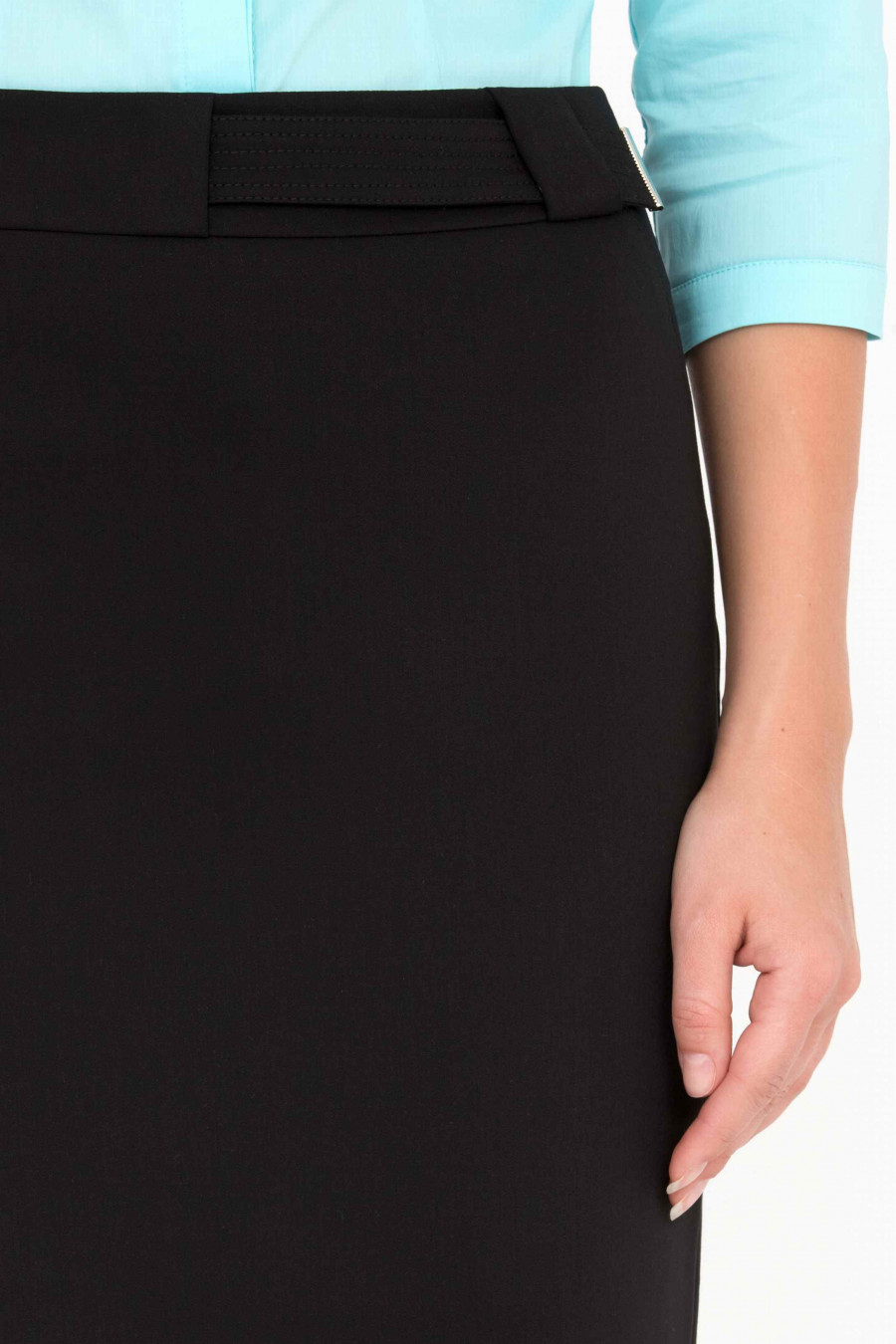 Юбка-карандаш выше колена с подкладом. Оформлена тканевым поясом.