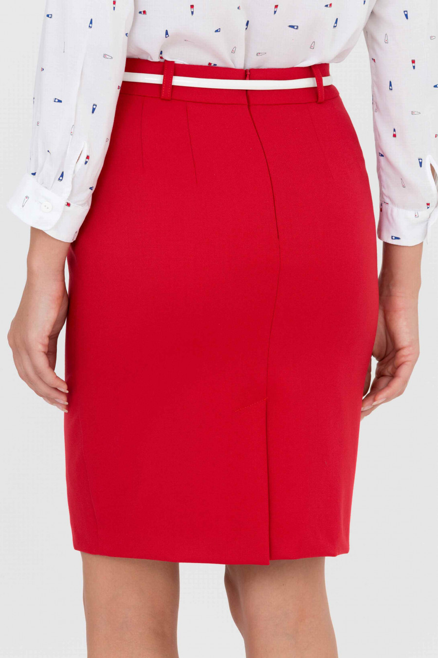 Эффектная юбка-карандаш красного цвета. Ткань эластичная, приятная на ощупь. Ремешок продается отдельно. Отличная модель на повседневную носку.