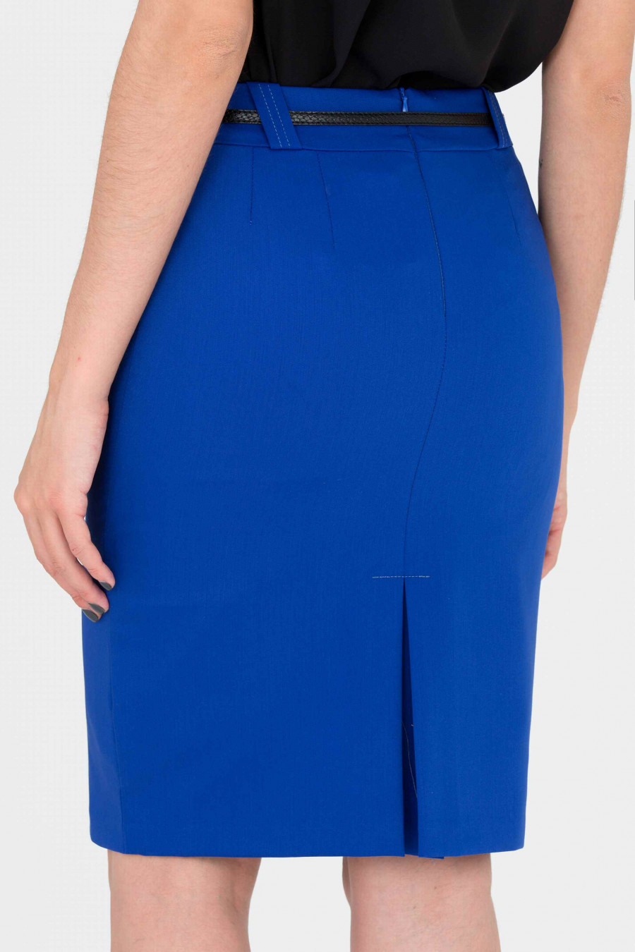 Элегантная юбка на поясе цвета электрик. Ткань эластичная, приятная на ощупь. Есть подкладка из полиэстера. Разрез сзади оформлен аккуратными складками. На поясе есть крупные шлевки, ремешок продается отдельно. Очень комфортная модель на повседневную носку, отлично подойдет для офиса.