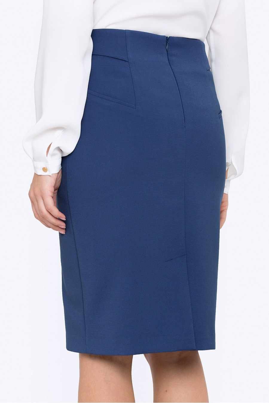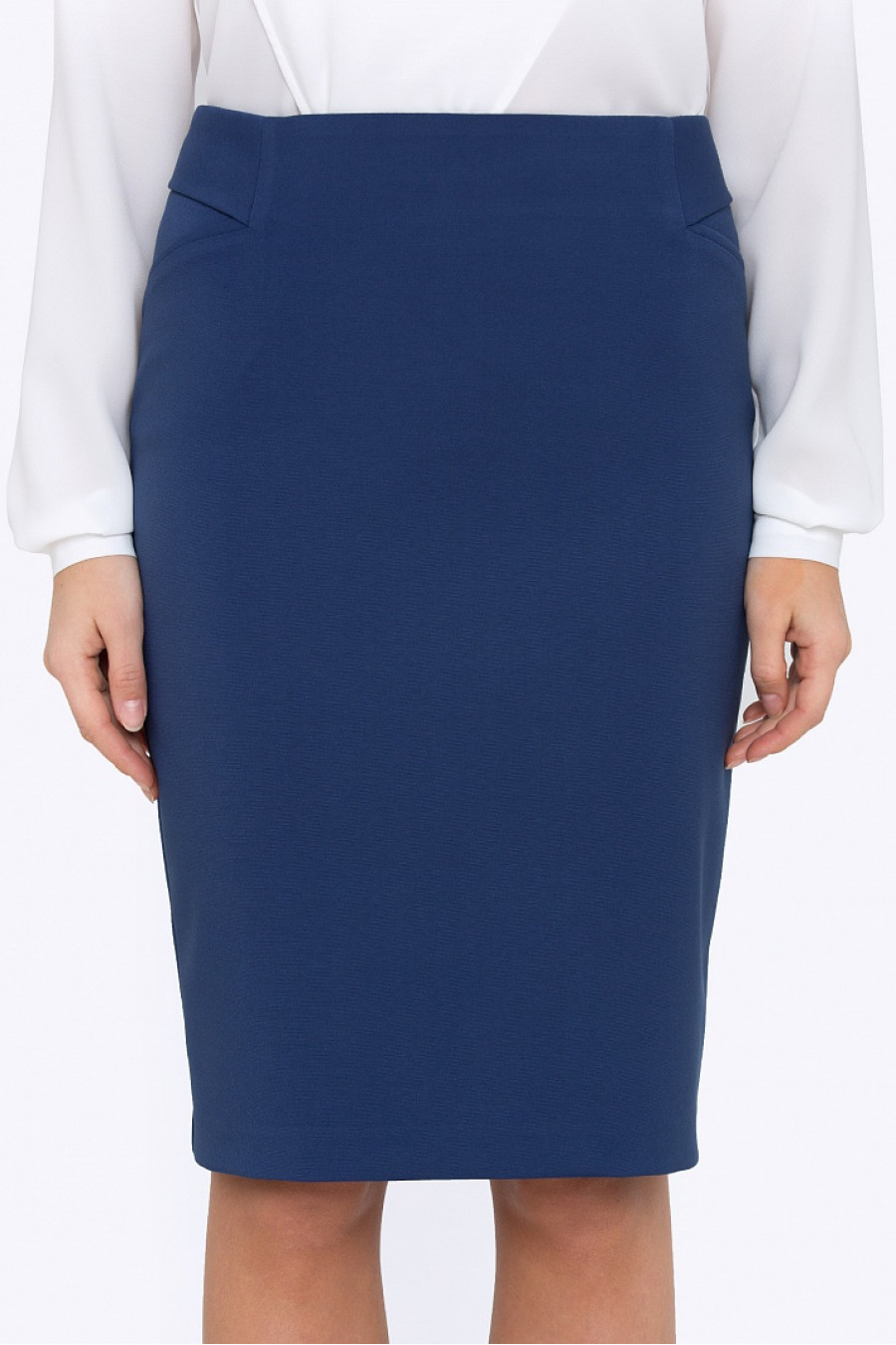 Юбка-карандаш синего цвета. Ткань мягкая, эластичная, очень приятная на ощупь. Юбка по бокам оформлена имитацией карманов с декоративной вставкой. Есть подкладка из полиэстера. Юбка идеально облегает фигуру, смотрится очень женственно.