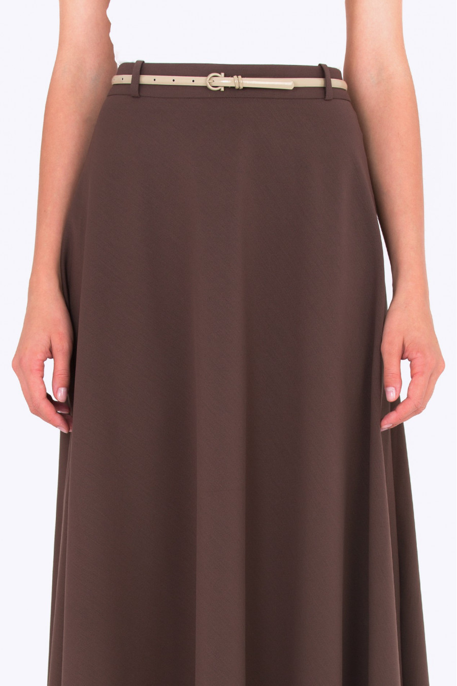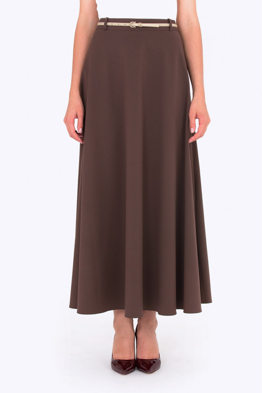 Роскошная расклешенная юбка на поясе. Ткань плотная, струящаяся приятного шоколадного цвета. Без подкладки. На поясе есть шлевки, ремешок продается отдельно. Юбка отлично подойдет, как для повседневной носки, так и для торжественного мероприятия. Поможет создать женственный, элегантный образ. Образ на фотографии дополняет блузка b 2202-fidan.
