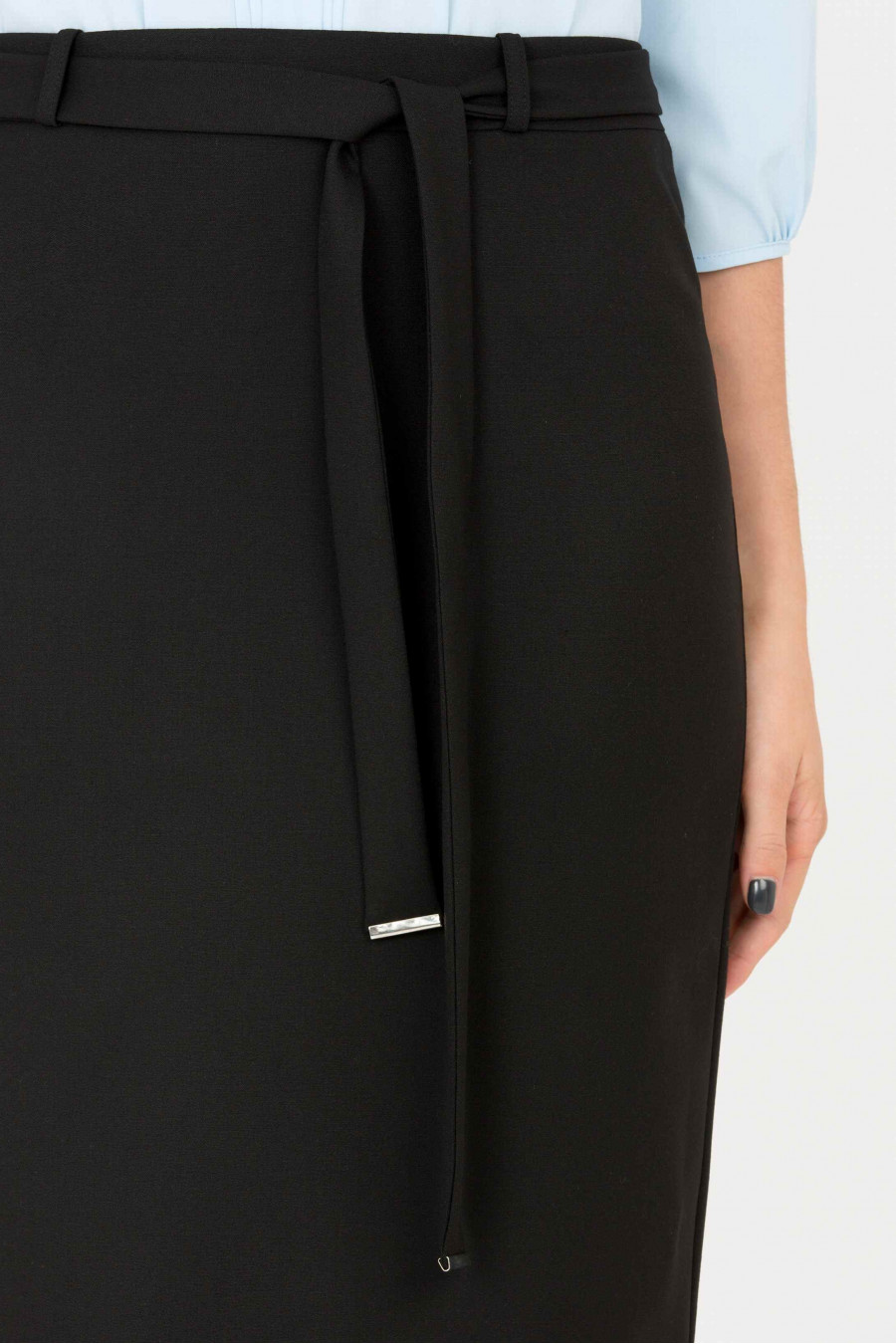 Элегантная юбка черного цвета. Ткань эластичная, гладкая, очень приятная на ощупь. Юбка хорошо сидит по фигуре. В комплекте идет симпатичный тканевый пояс. Есть подкладка из полиэстера. Юбка хорошо подойдет для офиса, отличная базовая модель. Образ на фотографии дополняет блузка b 2170/candy.
