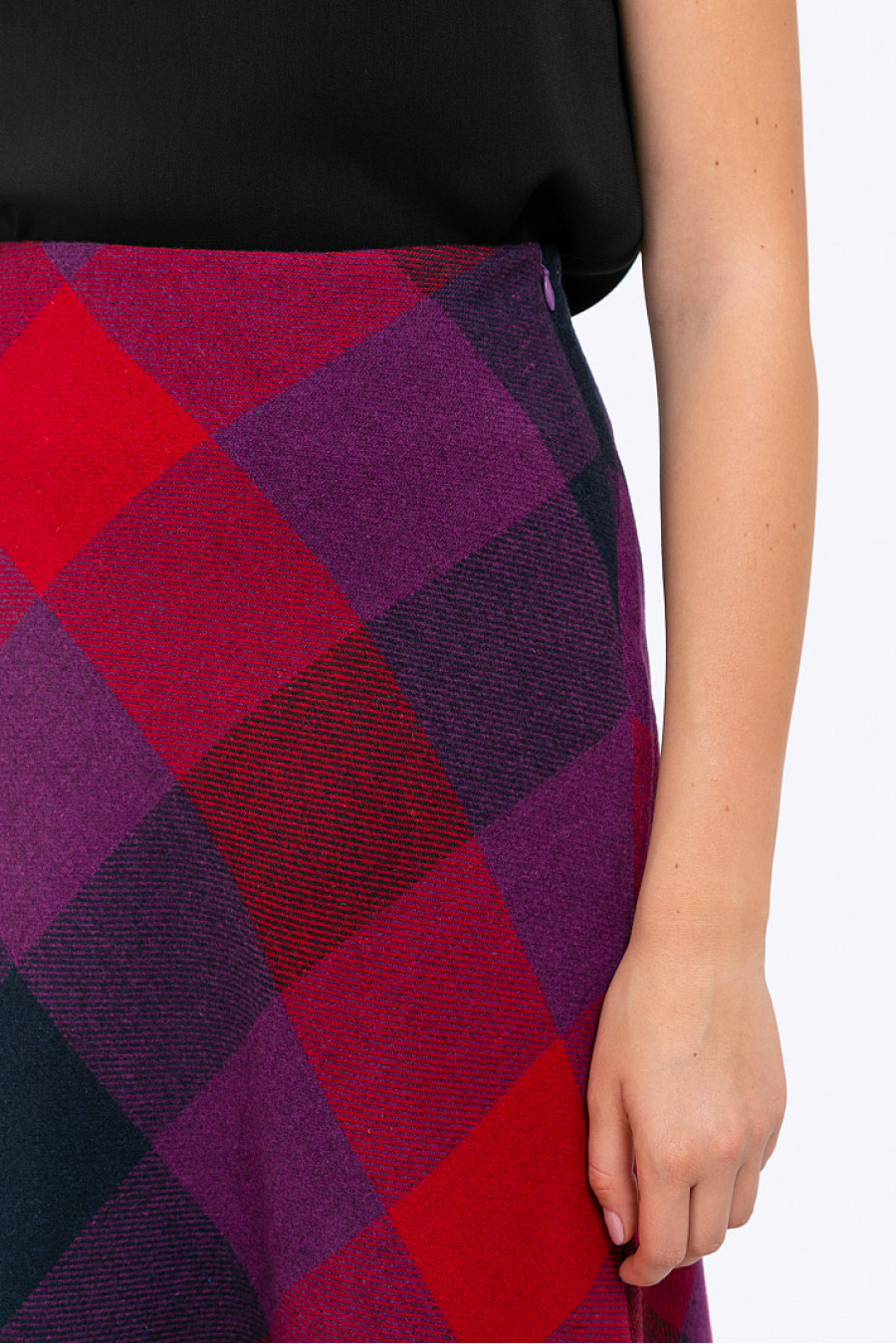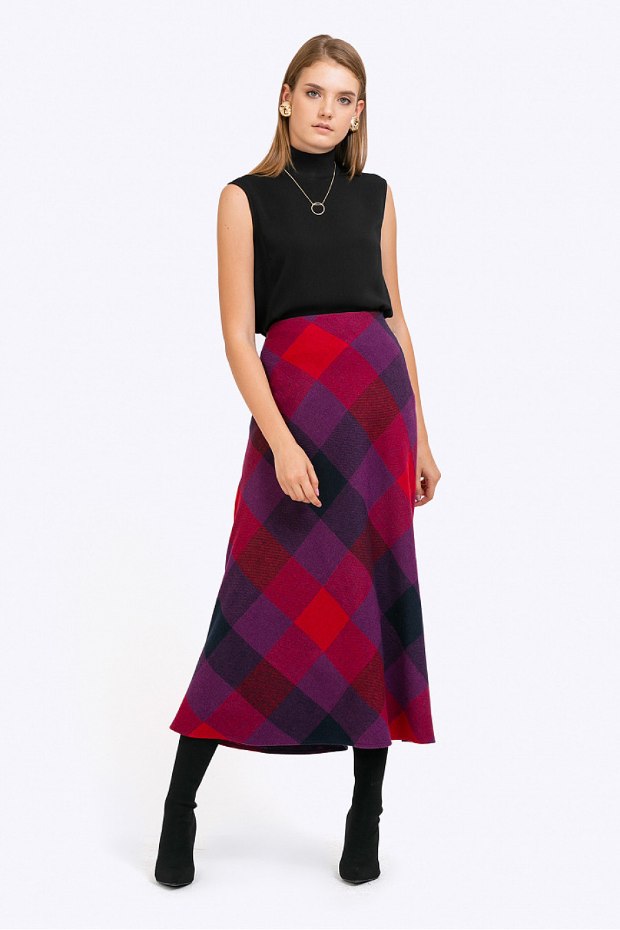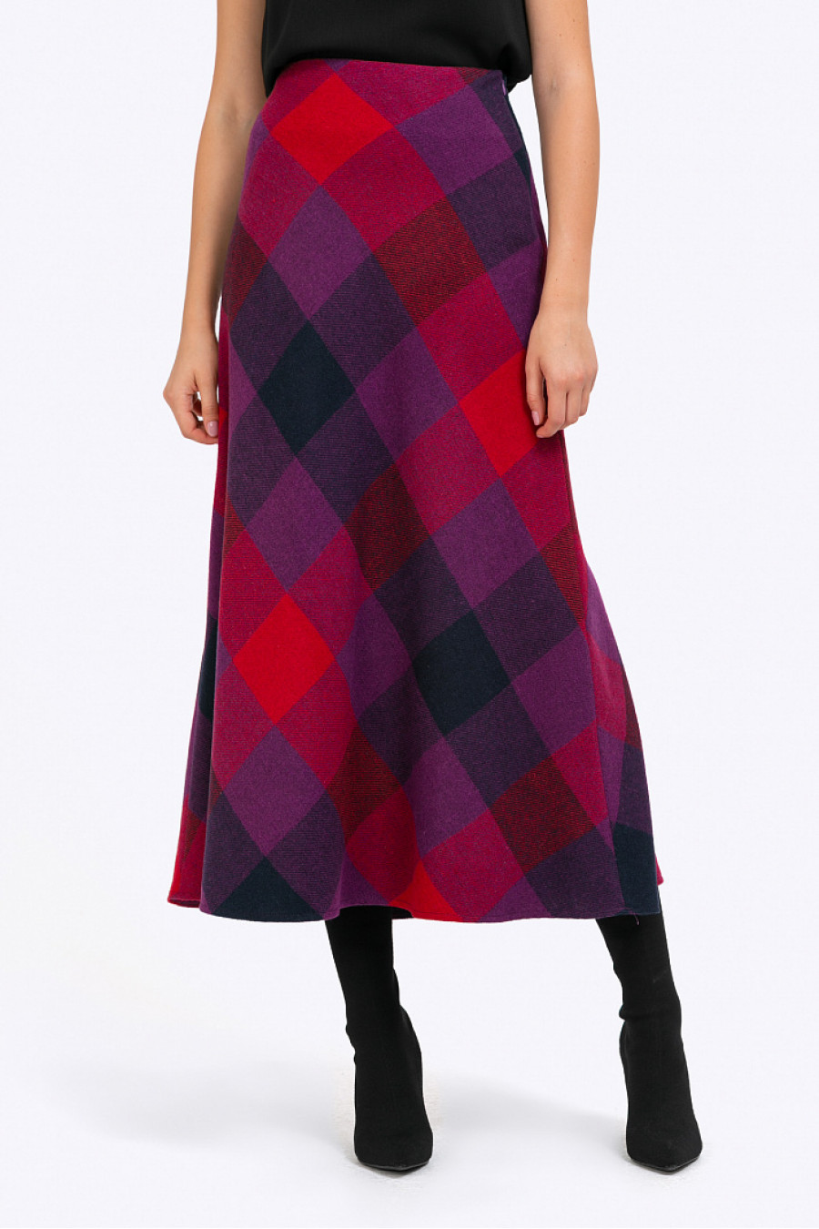 Длинная юбка, выполненная в насыщенной красно-фиолетовой цветовой гамме. Модель трапециевидного силуэта, скроена по косой. Имеет мягкие женственные линии, выполнена без пояса. Застёжка «молния» расположена в боковом шве. Рост фотомодели 177 см.