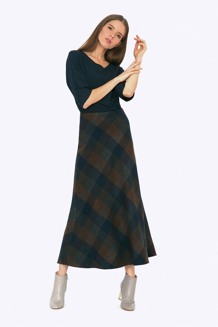 Шерстяная юбка-трапеция. Ткань плотнаяв крупную клетку. Есть подкладка из полиэстера. Сбоку застежка-молния. Юбка хорошо сидит по фигуре, зрительно удлиняет силуэт, поможет создать женственный, притягательный образ. Рост фотомодели 178см.