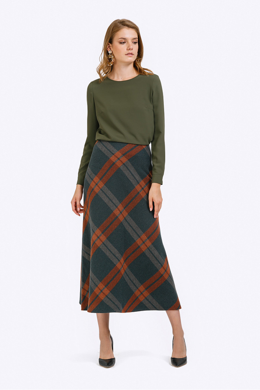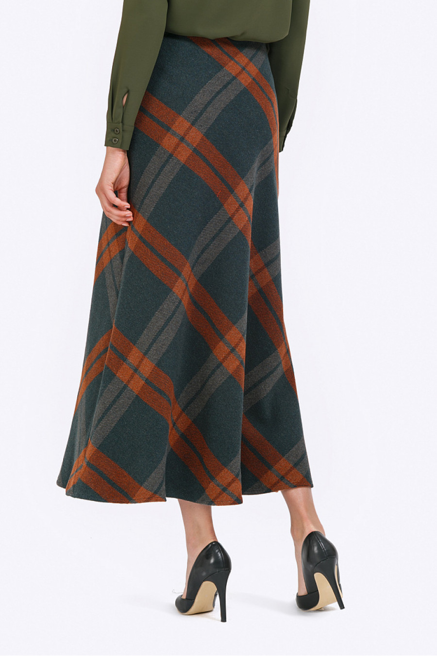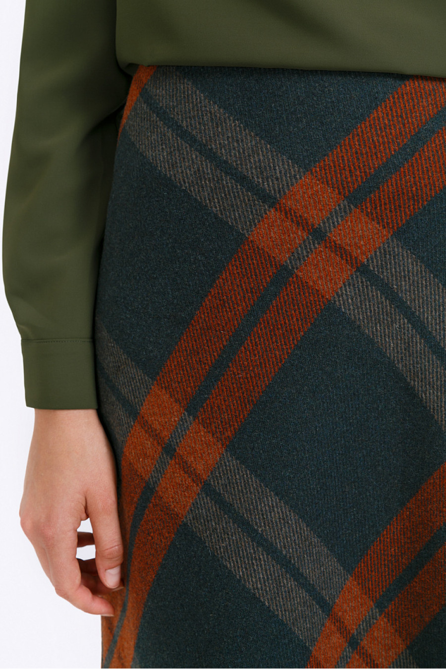 Длинная юбка-А-силуэта из плотной полушерсти с крупным геометрическимпринтом. Модель с мягкими женственными линиями, выполнена без пояса, застёжка«молния» находится в боковом шве. Основной акцент направлен на расположенную покосой клетку в контрастной зелёно-оранжевой цветовой гамме. Образ на фото дополнен блузкой B2324-mona . Рост фотомодели 177 см.