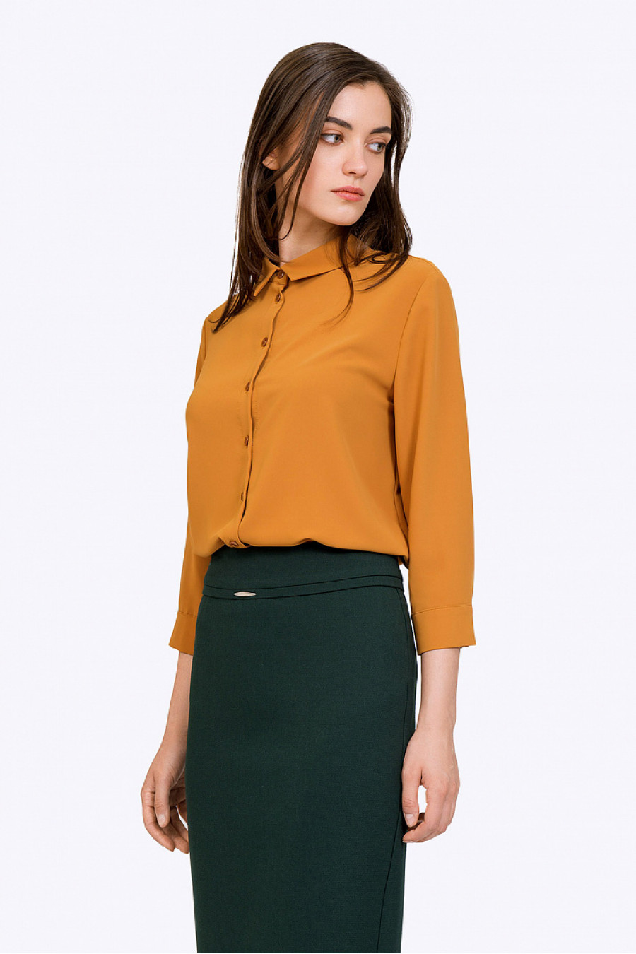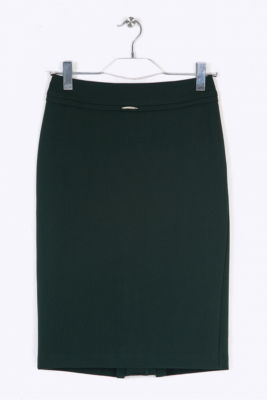 Тёмно-зелёная прямая юбка-миди в стиле «деловой шик». Модель выполненана подкладке, плотно облегает линию бёдер, имеет кокетку оригинального покроя,спереди дополненную небольшим украшением серебристого цвета. На спинке всрединном шве расположены застёжка «молния» и веерная складка с тремя пуговичками. Образ на фото дополнен блузкой B2198-samuila . Рост фотомодели 176 см.