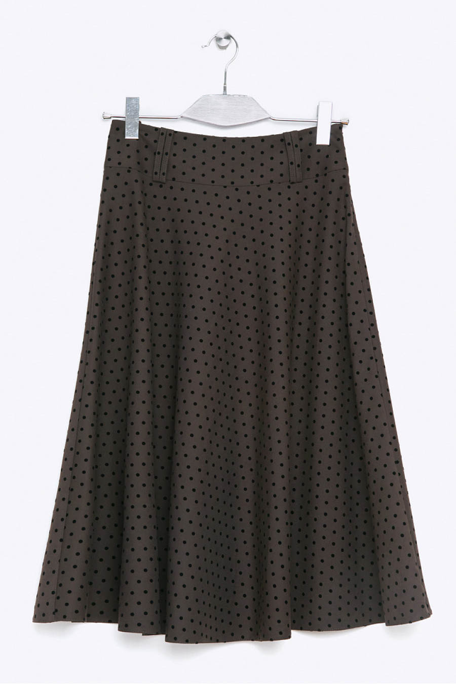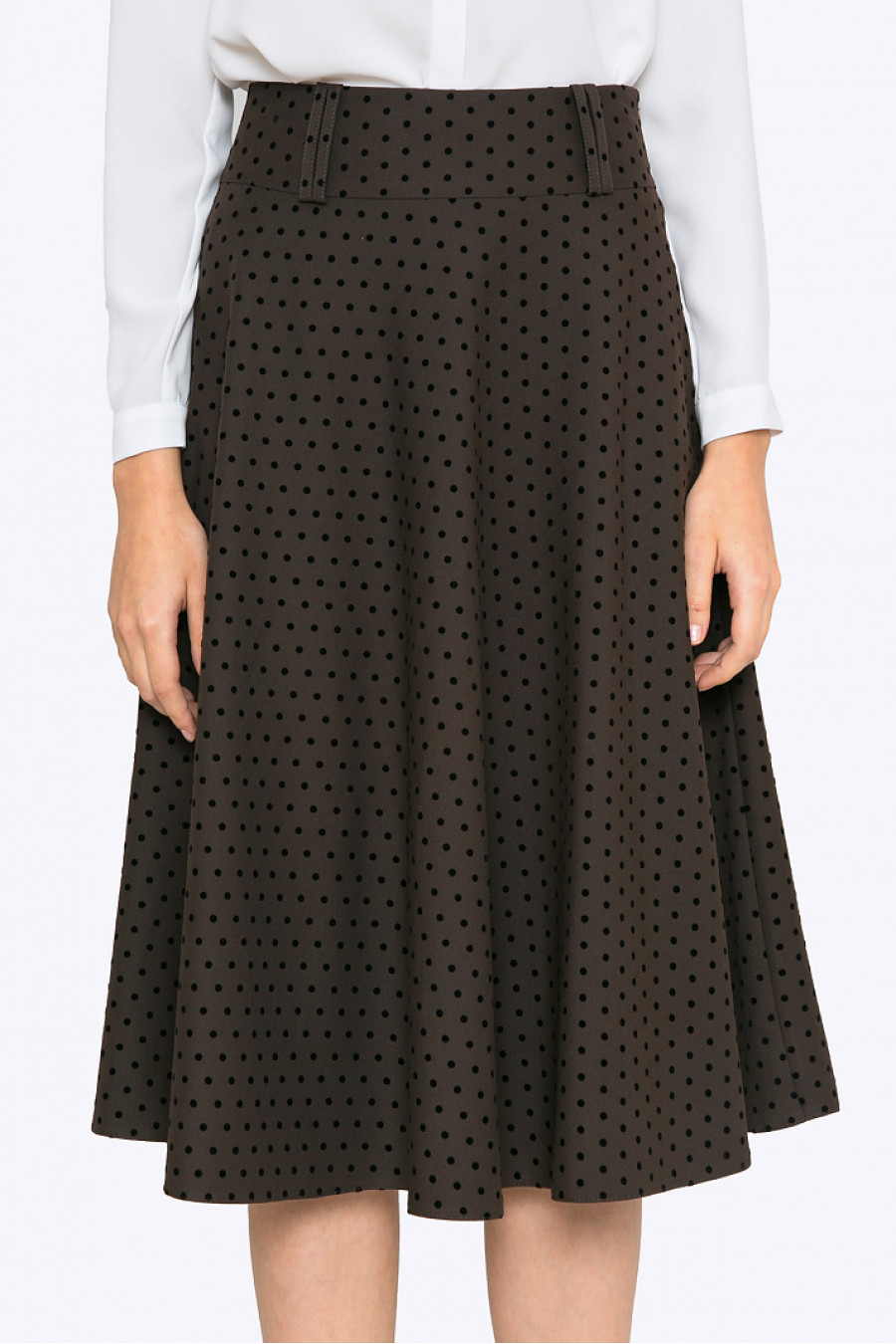 Расклешенная юбка миди. Ткань мягкая, коричневого цвета в мелкий горох. На поясе есть шлевки. Без подкладки. Юбка поможет создать нежный, романтичный образ, хорошо смотрится с классическими лодочками и однотонными блузками. Рост фотомодели 178см.