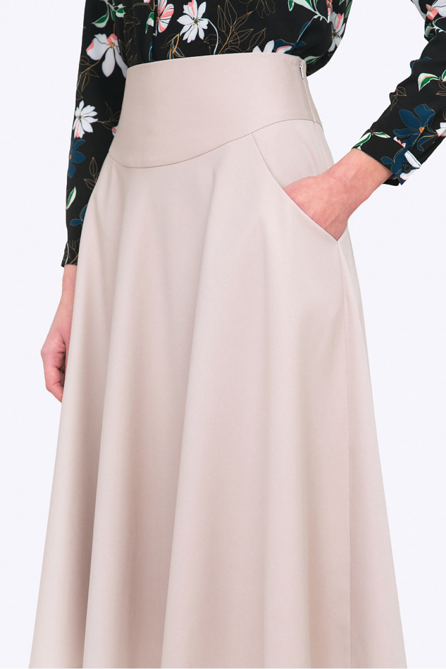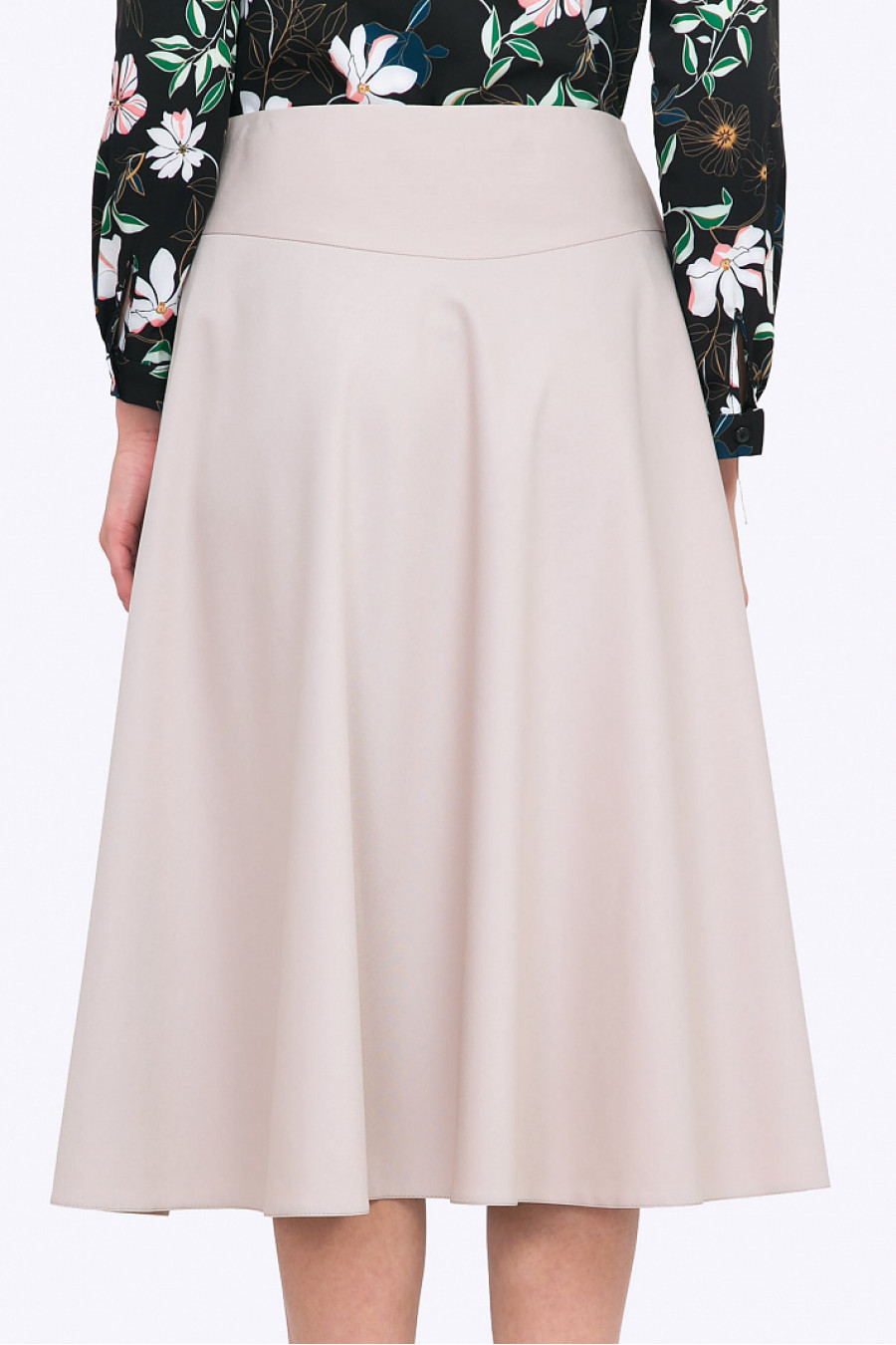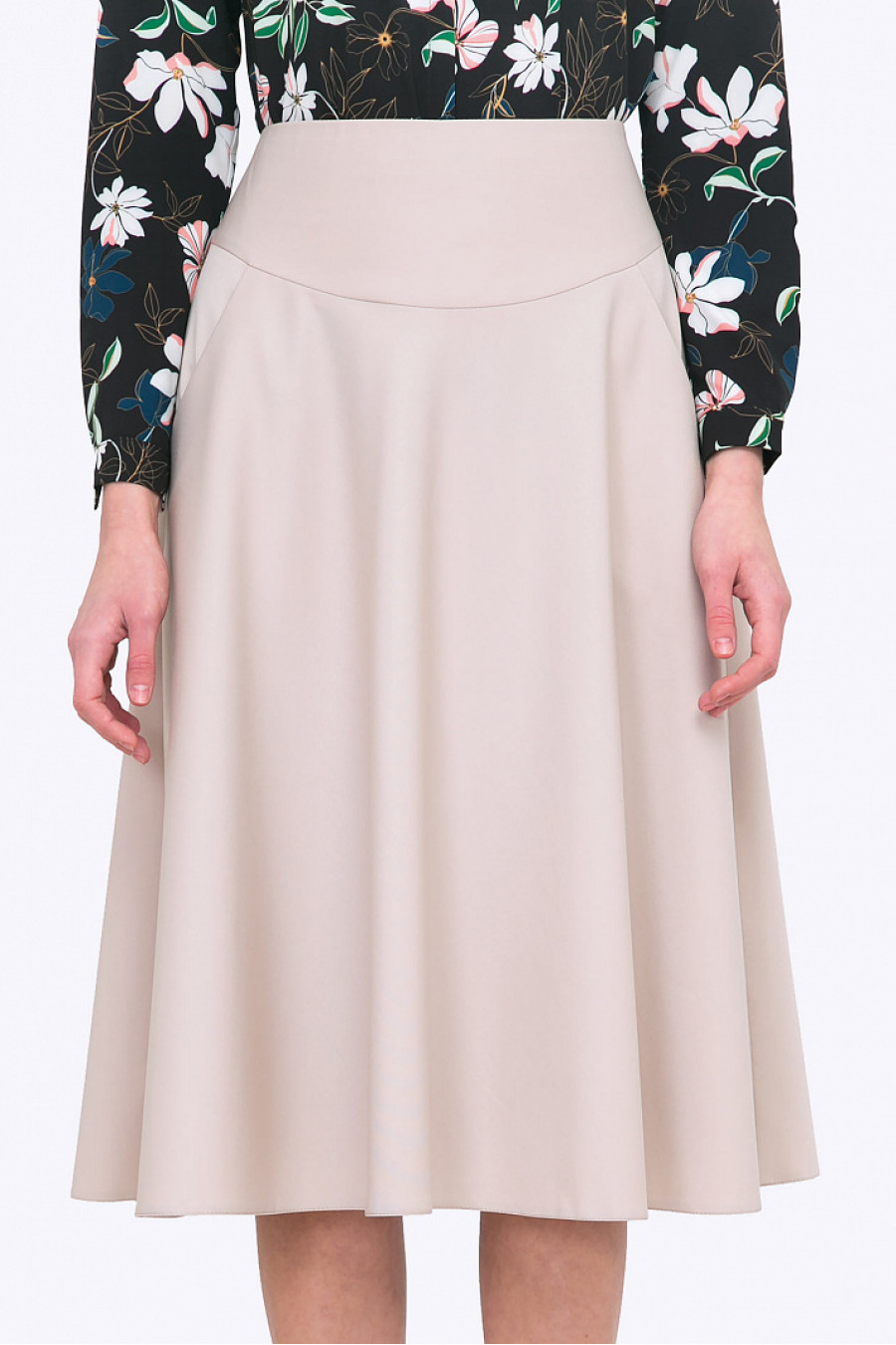 Юбка-клеш на кокетке из уютной смесовой ткани цвета айвори создает неповторимый женственный образ. Длина миди позволяет вписать юбку как в деловой, так и в повседневный гардероб. Юбка без подклада. Длина градируется от размера к размеру. Образ на фото дополнен блузкой B2300-fiji . Рост фотомодели 176 см.