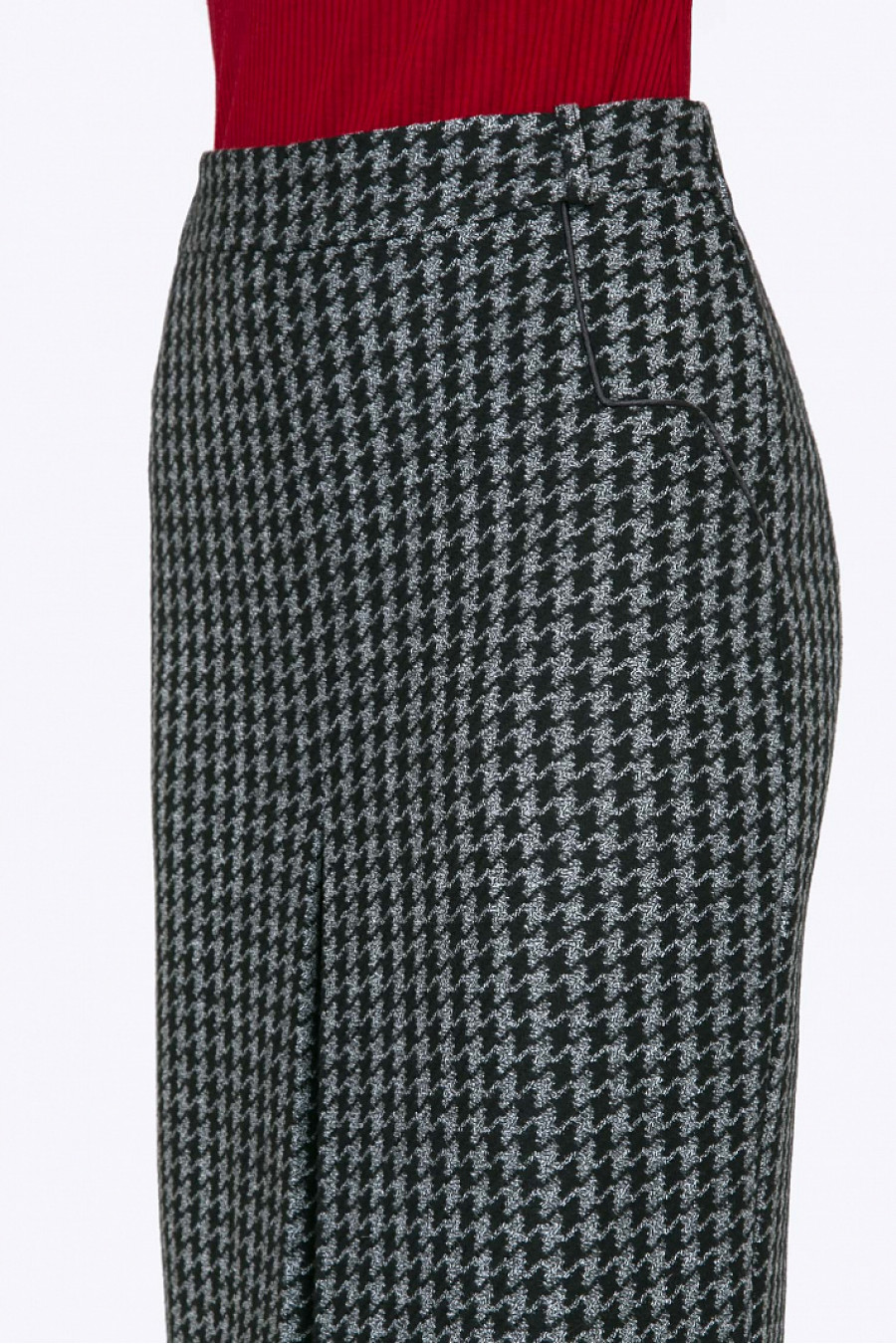 Элегантная офисная юбка. Спереди декорирована фигурными бочками с черным кантом. На поясе есть шлевки. Стильная изюминка юбки - встречная складка с разрезом спереди. Сзади застежка-молния ишлица. Есть подкладка из полиэстера. Рост фотомодели 175 см.