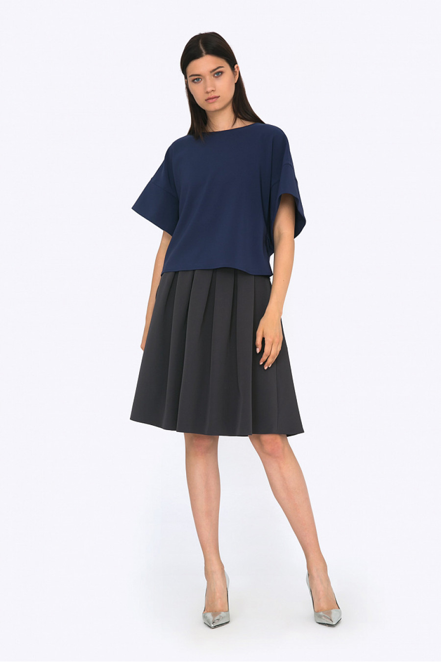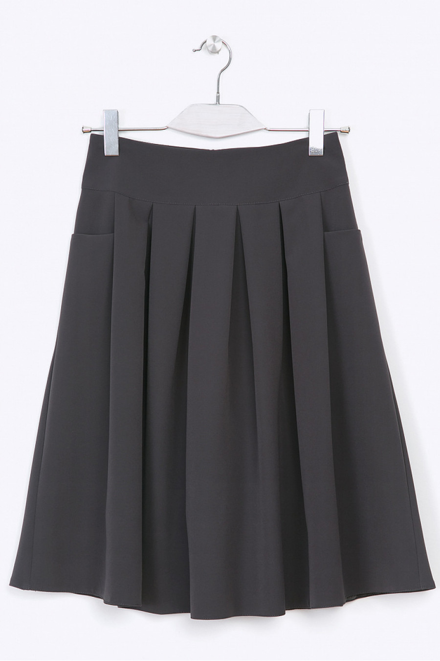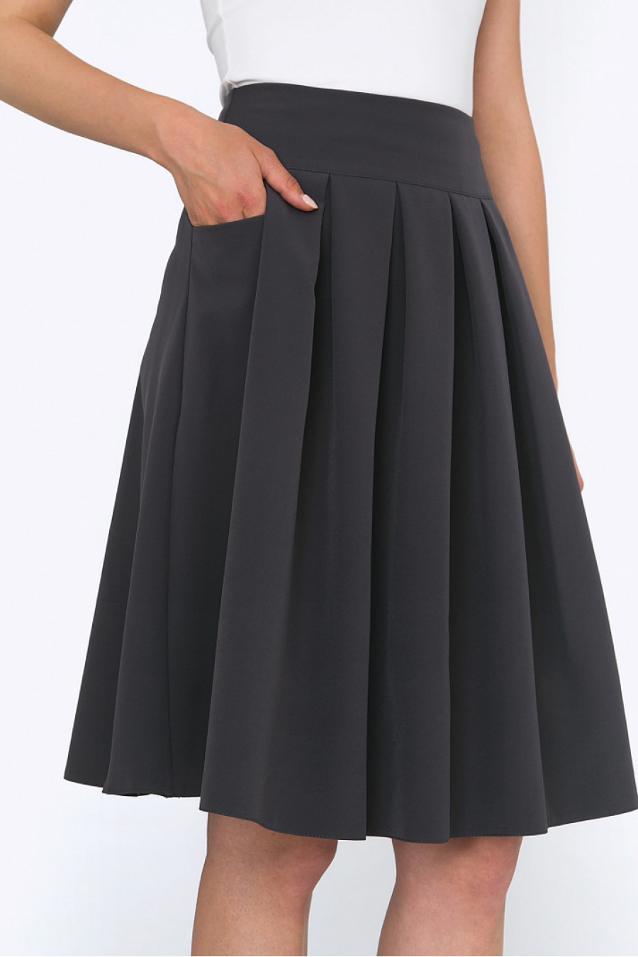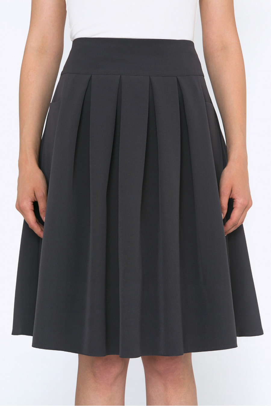 Расклешенная юбка со складками спереди. Ткань гладкая, струящаяся. По бокам функциональные карманы. Есть подкладка из полиэстера. Юбка подойдет для повседневной носки.