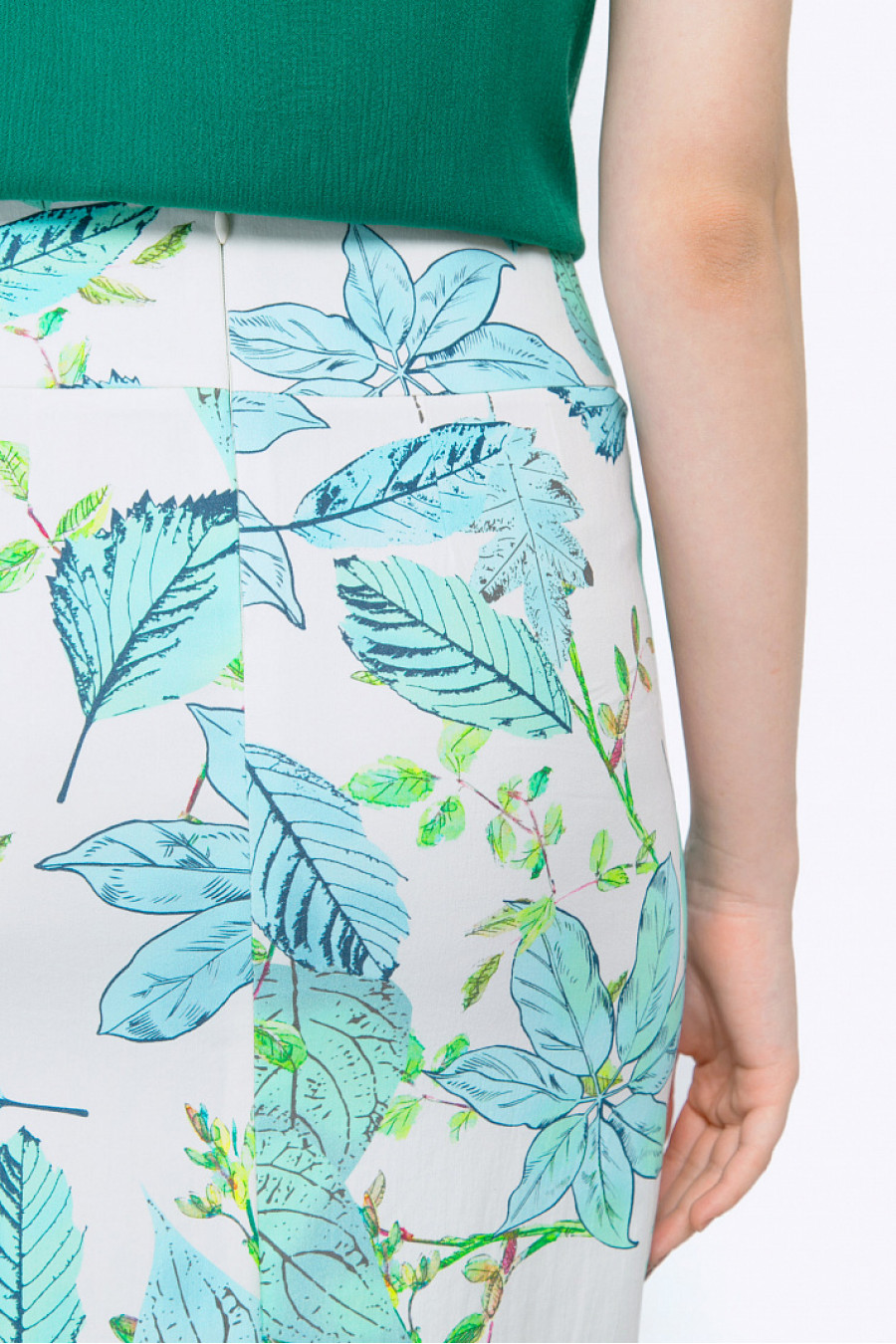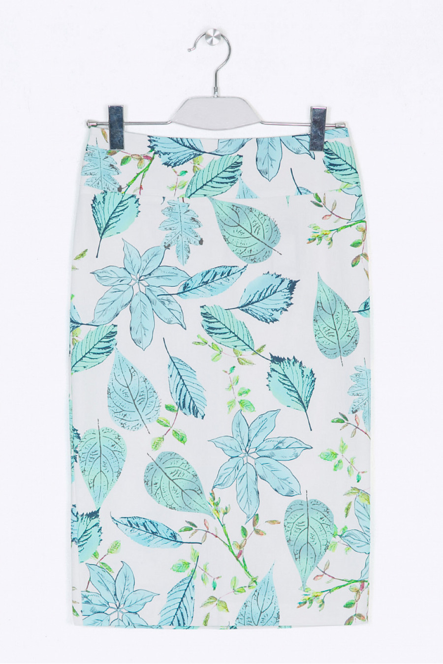 Белая юбка-карандаш с холодным растительным орнаментом в бледно-голубых и зелёных тонах. Выполнена из хлопчатобумажной ткани с добавлением синтетических волокон, обеспечивающих отличную посадку по фигуре, несминаемость и долговечность. Модель имеет широкую кокетку, сзади шлицу и замок – молнию. Рост фотомодели 176 см.