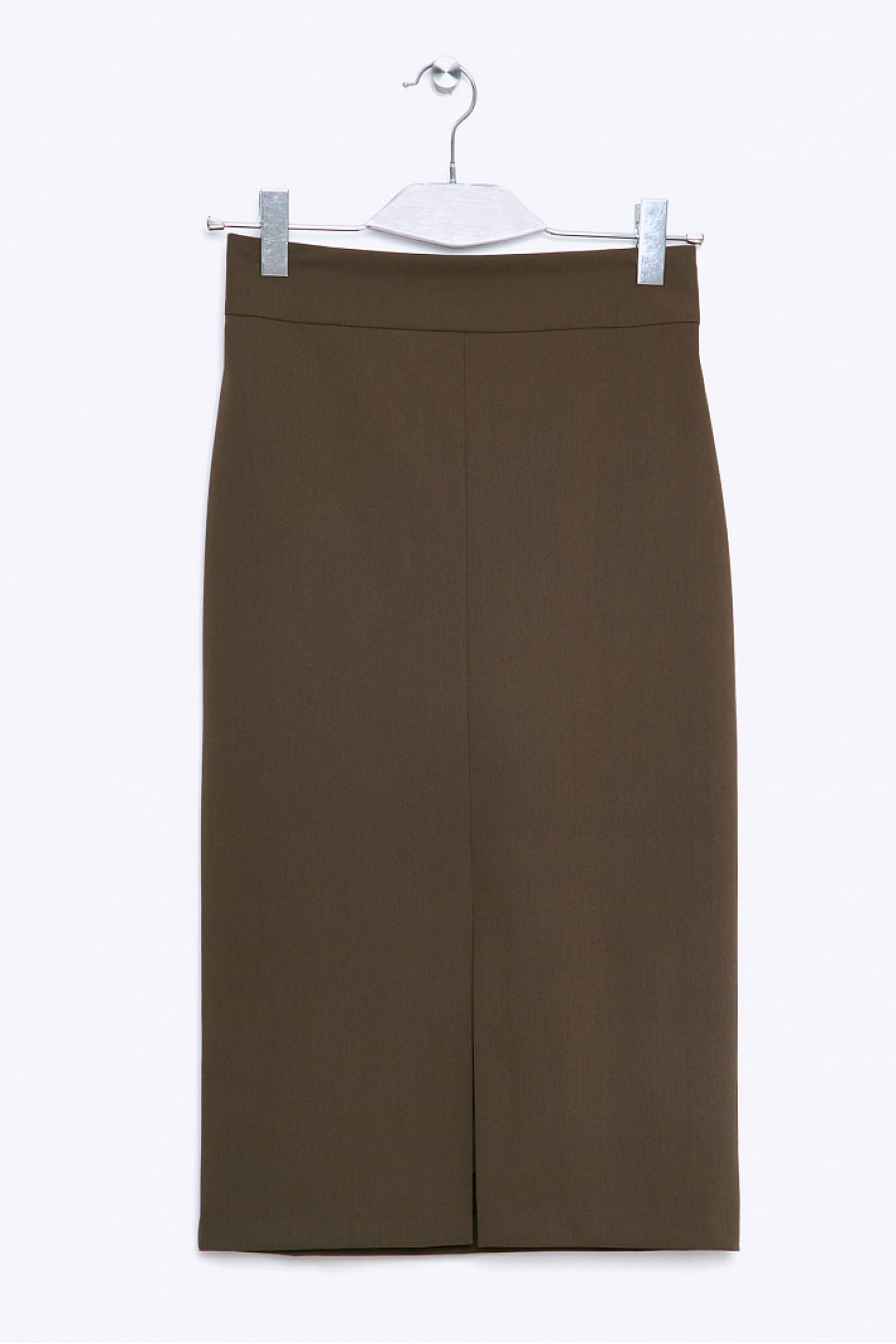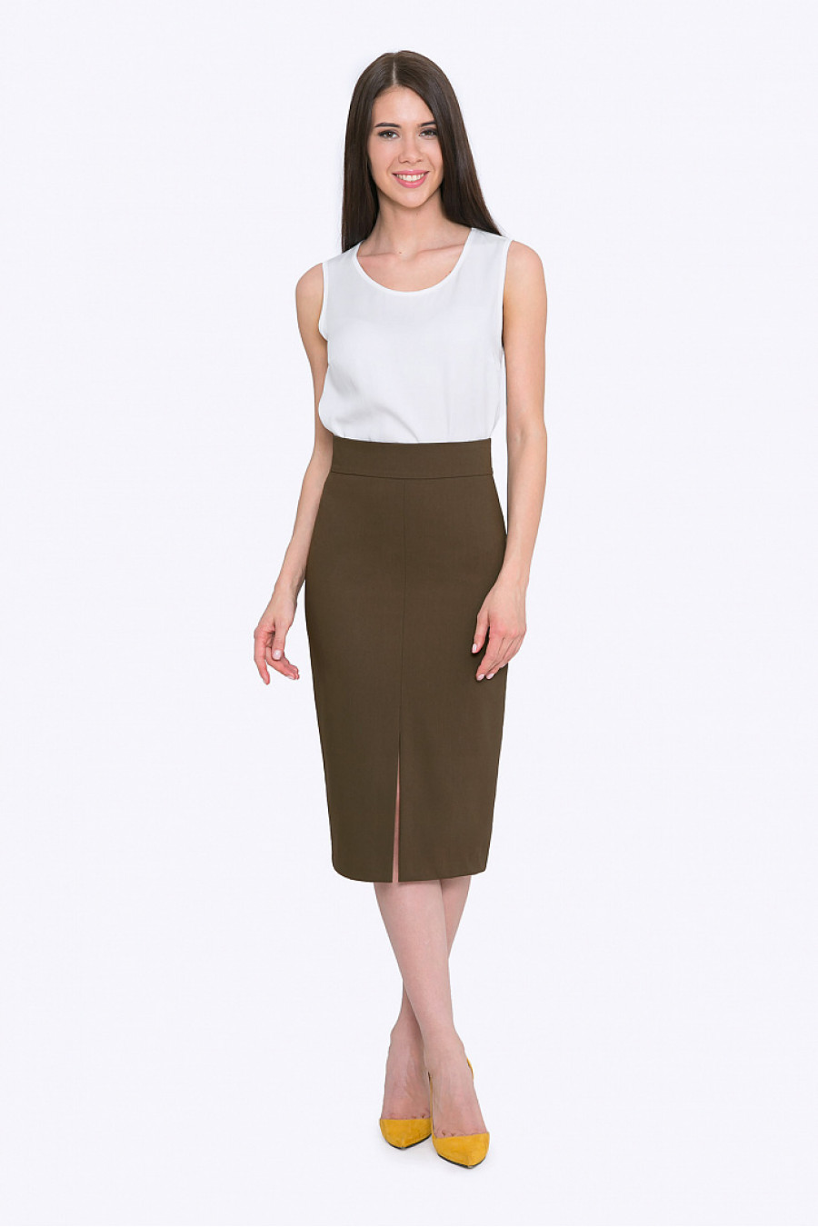 Юбка-карандаш с разрезом. Ткань структурная, цвета хаки. Есть подкладка. Юбка идеально облегает фигуру, позволяет зрительно вытянуть силуэт, хорошо смотрится с туфлями на высоких каблуках.