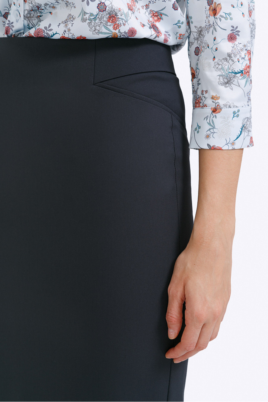 Тёмно-серая юбка-карандаш для строгих образов в офисном стиле. Модель с высокой посадкой, плотно облегает линию бёдер, выполнена без пояса. Элементом декора служат расположенные по бокам фигурные вставки с отстрочкой. Застёгивается на «молнию», расположенную в среднем заднем шве. Высокая шлица обеспечивает свободу шага. Образ на фото дополнен блузкой B2198-katarzhina . Рост фотомодели 176 см.
