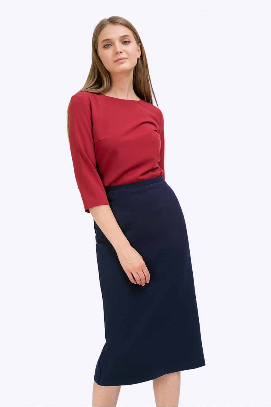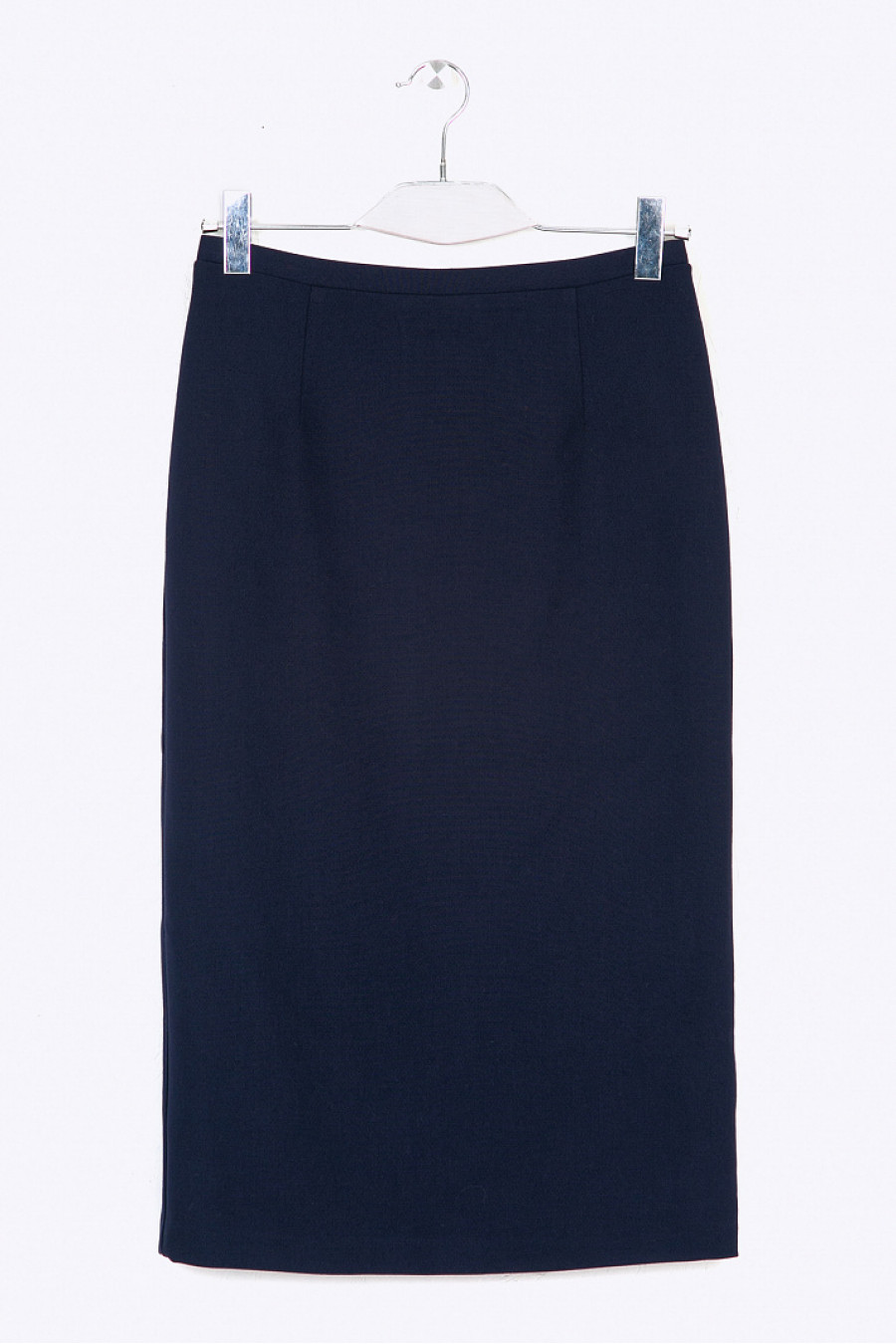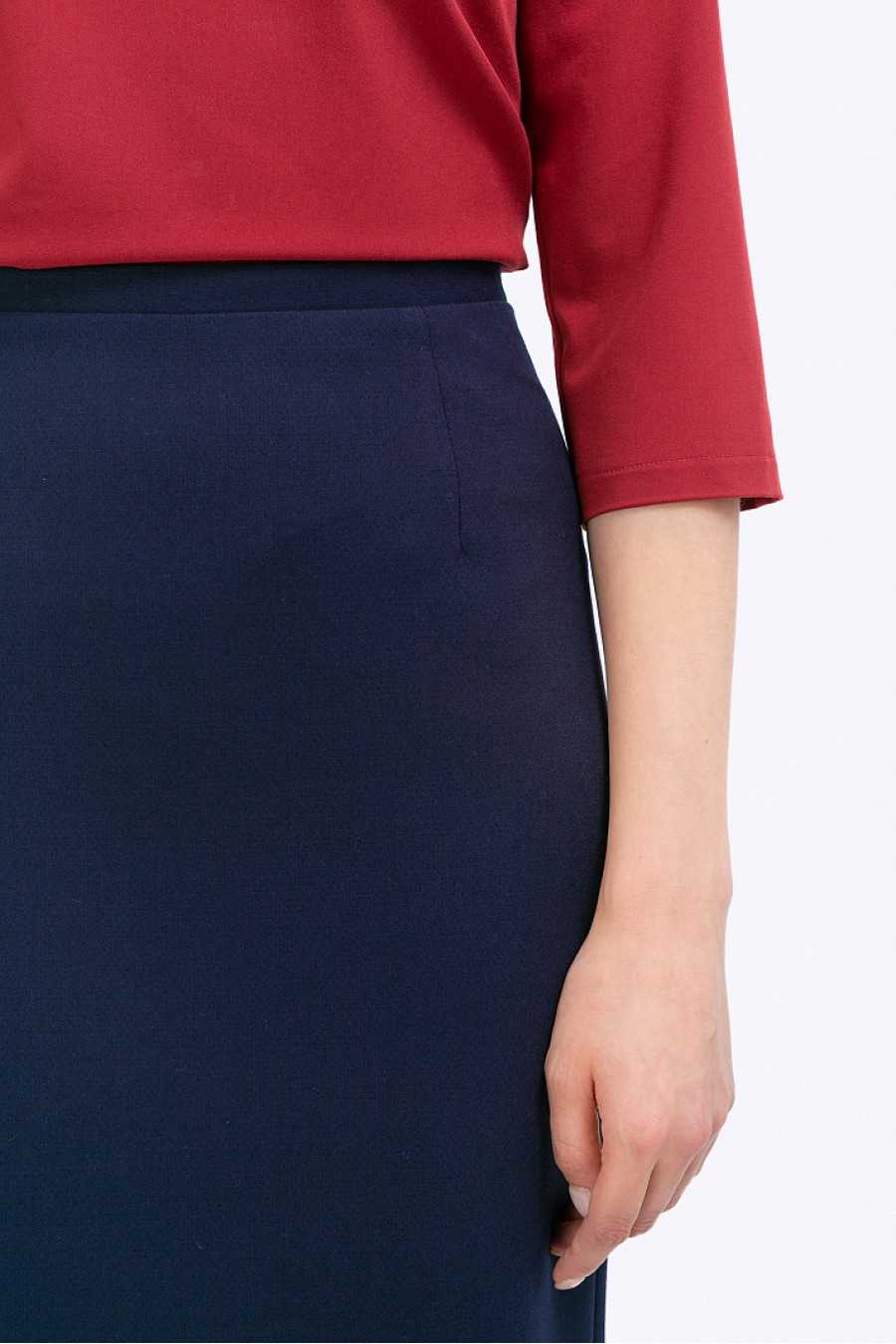 Темно-синяя юбка прямого силуэта с притачным поясом. На подкладке.Модель плотно облегает линию бёдер, имеет длину ниже колена. В заднем среднем шве расположены застёжка «молния» и разрез. Рост фотомодели 177 см.