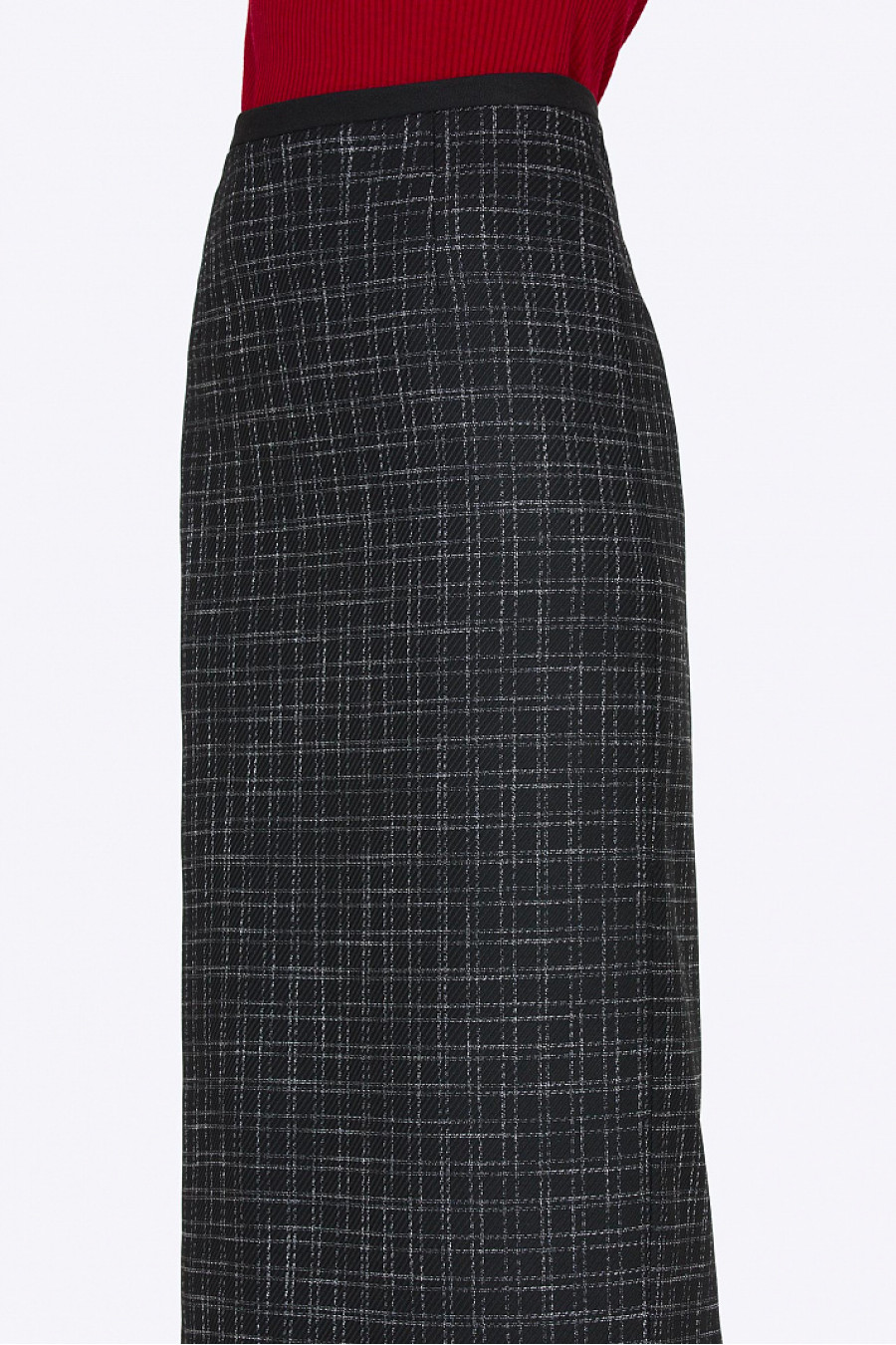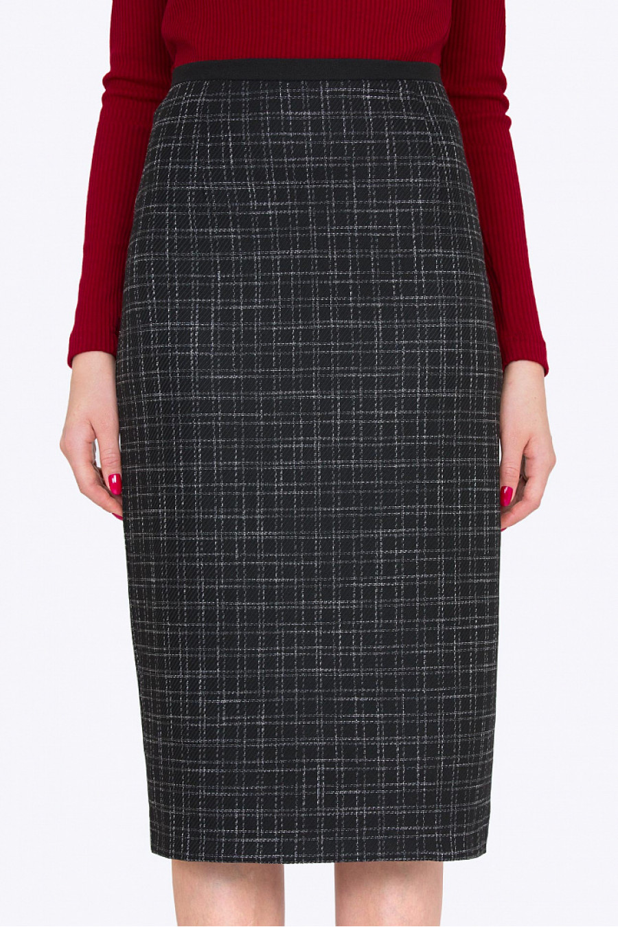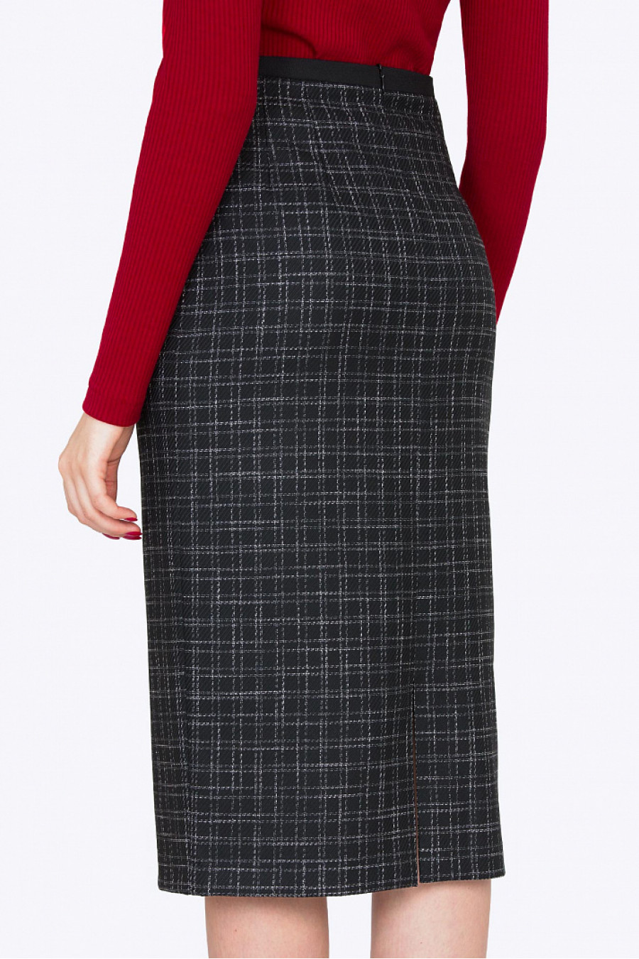 Облегающая юбка-миди. Ткань средней плотности. Пояс выполнен из кожи. Сзади застежка-молния и разрез. Есть подкладкаиз полиэстера. Юбка идеально сидит по фигуре, визуально вытягивает силуэт. Отличный вариант для офиса. Длина градируется от размера к размеру. Рост фотомодели 175 см.
