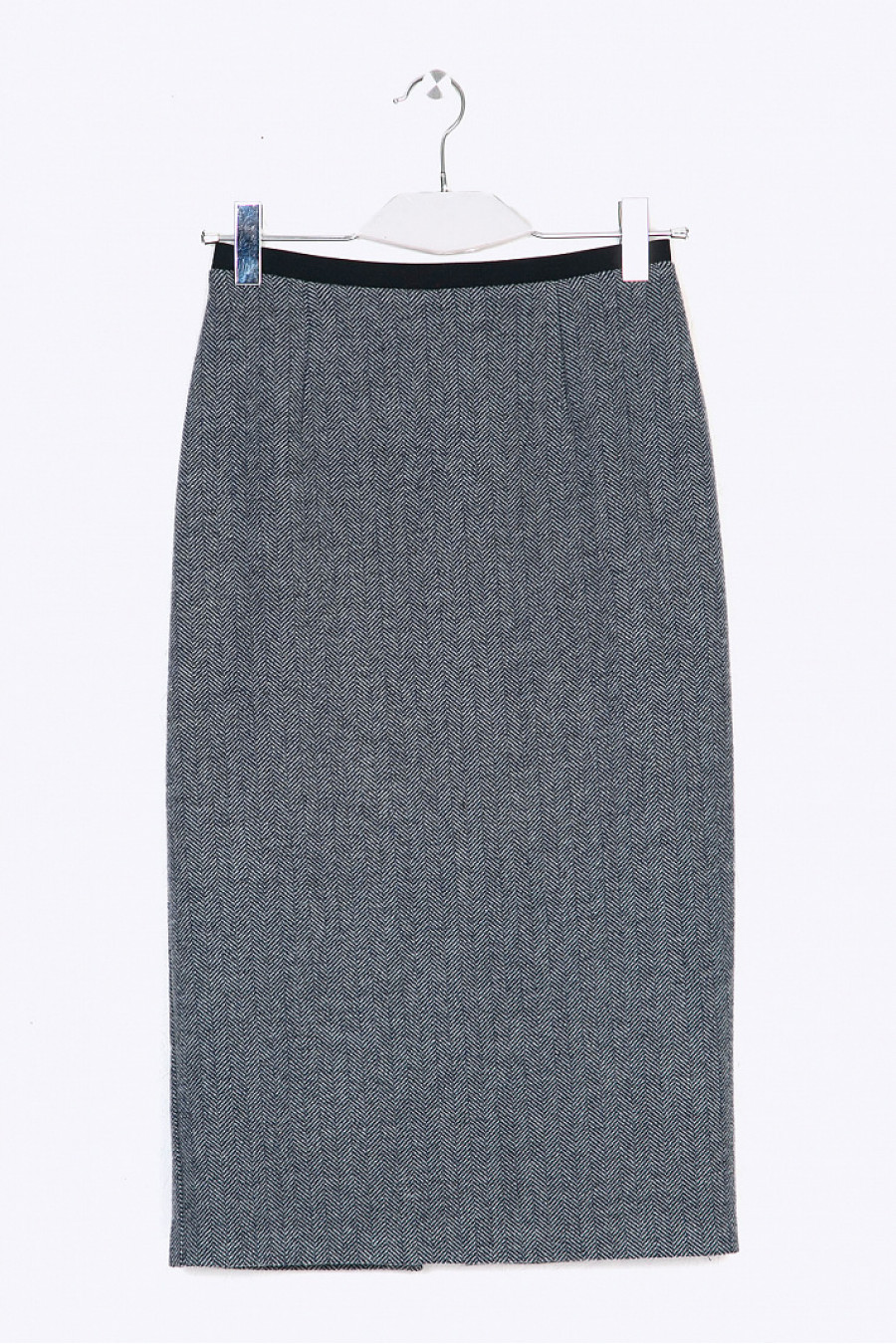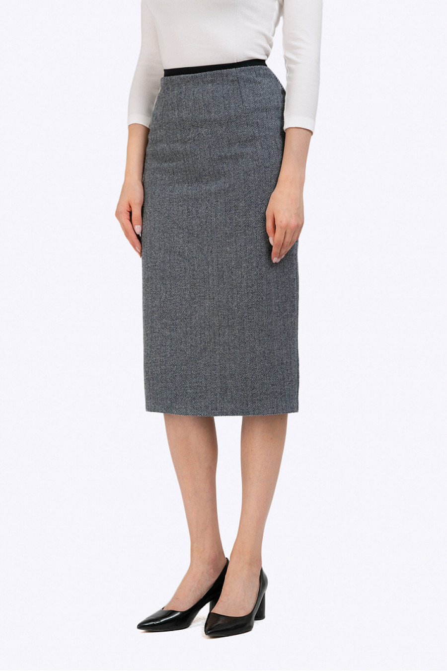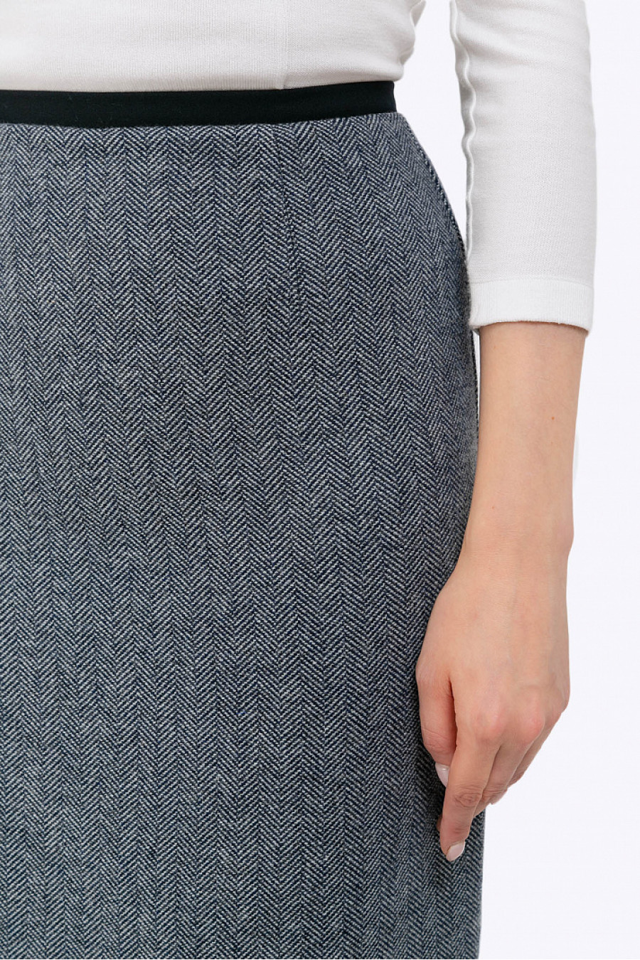 Юбка из полушерсти с плетением «елочка» н аподкладке. Зауженная модель,плотно облегает линию бёдер. Дополнена узким притачным поясом контрастного чёрного цвета. На спинке в среднем шве расположены застёжка«молния» и шлица. Рост фотомодели 177 см.