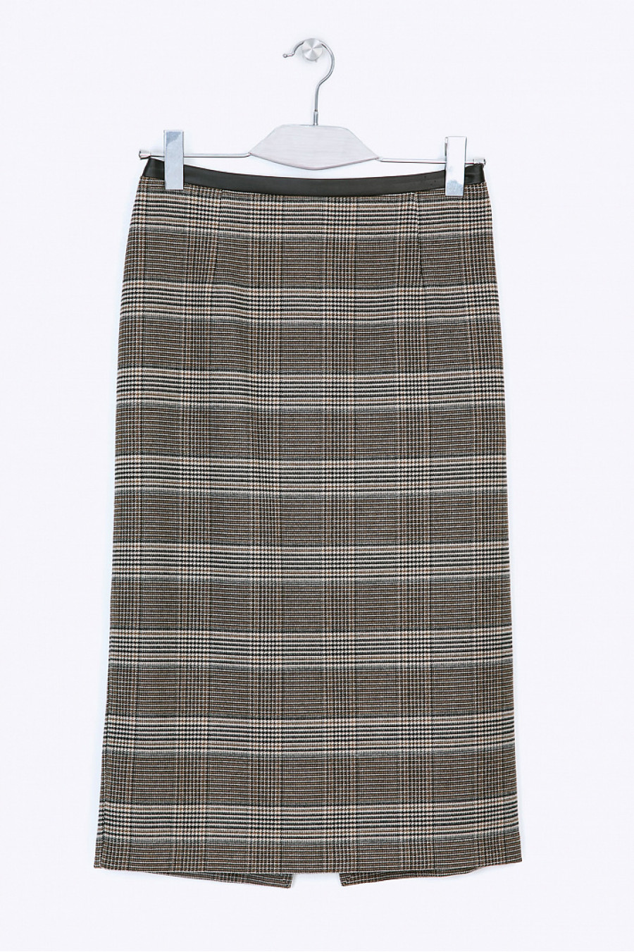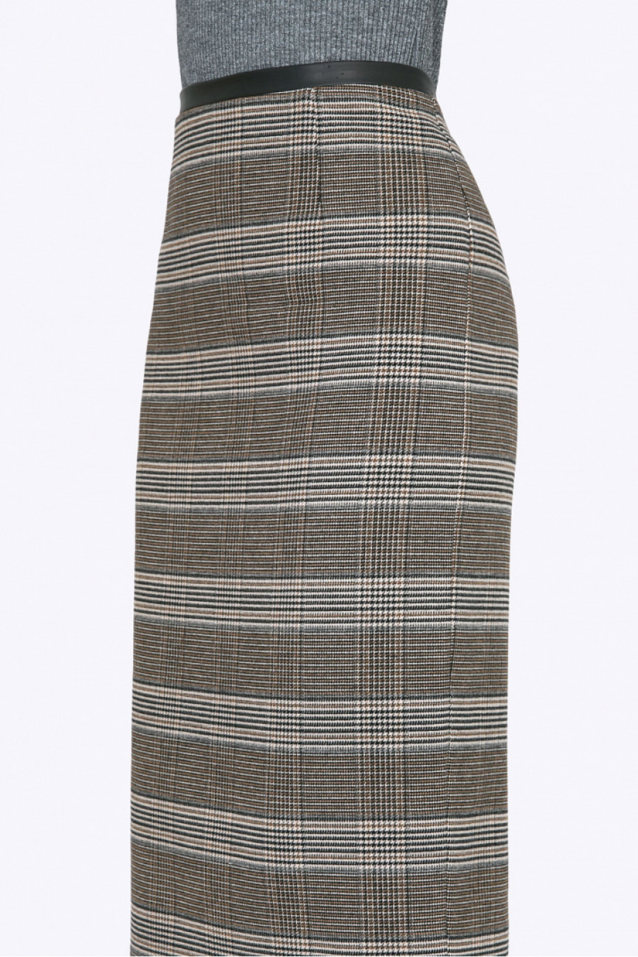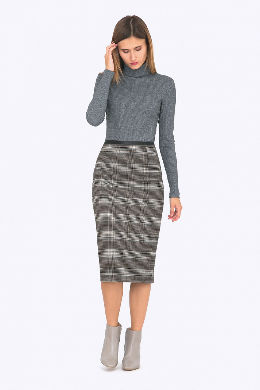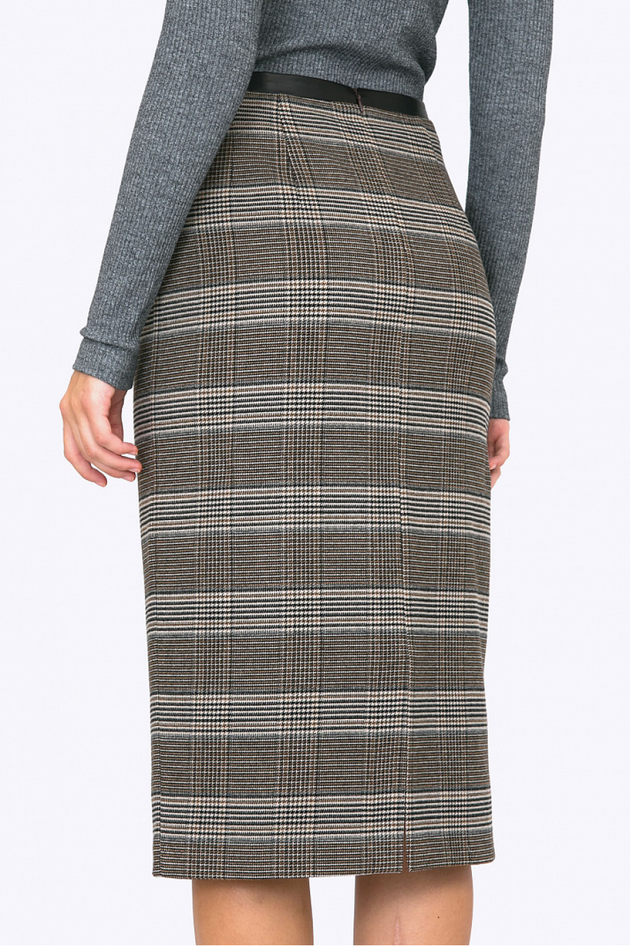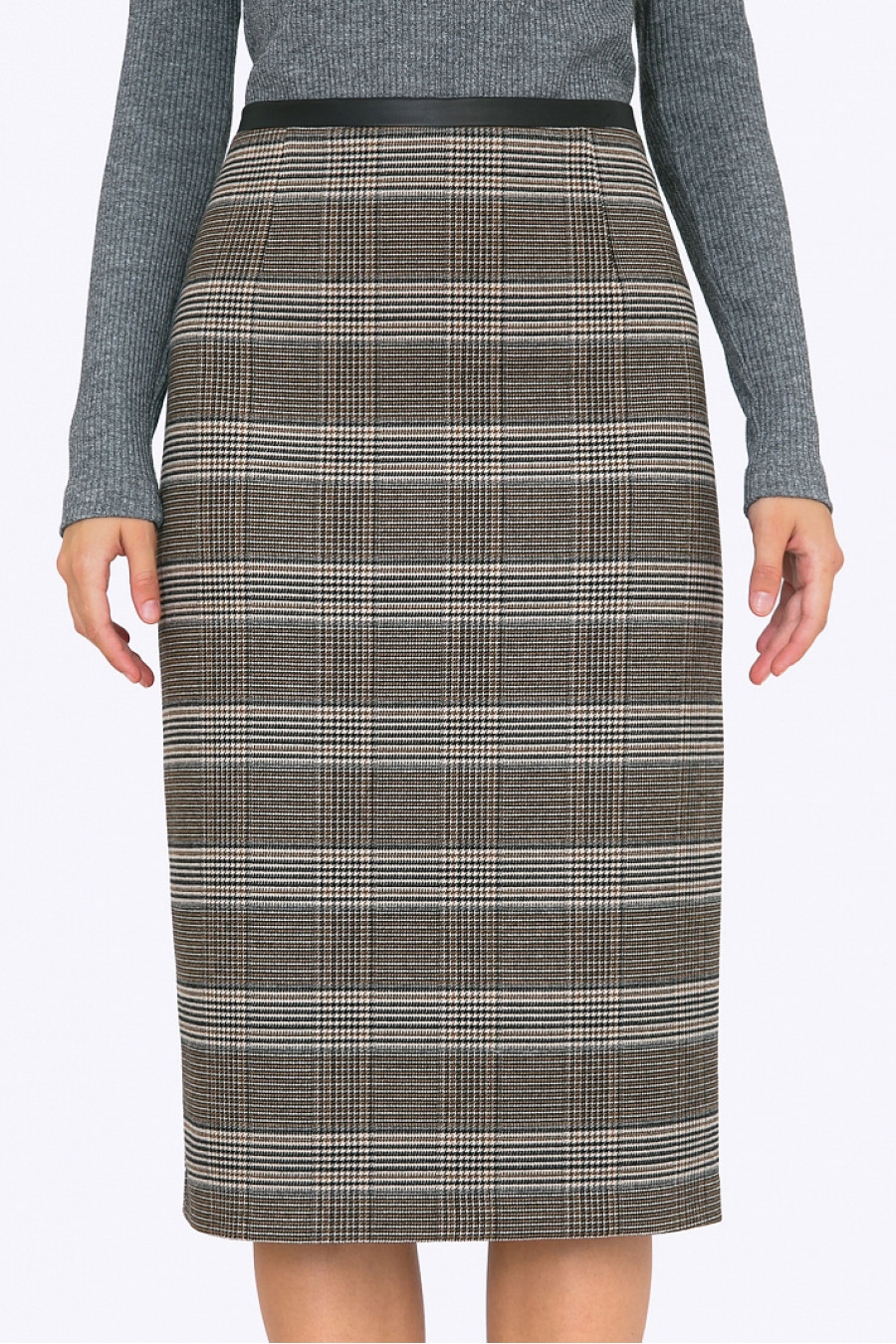 Облегающая юбка-миди. Ткань средней плотности. Пояс выполнен из кожи. Сзади застежка-молния и разрез. Есть подкладкаиз полиэстера. Юбка идеально сидит по фигуре, визуально вытягивает силуэт. Отличный вариант для офиса. Длина градируется от размера к размеру. Рост фотомодели 175 см.