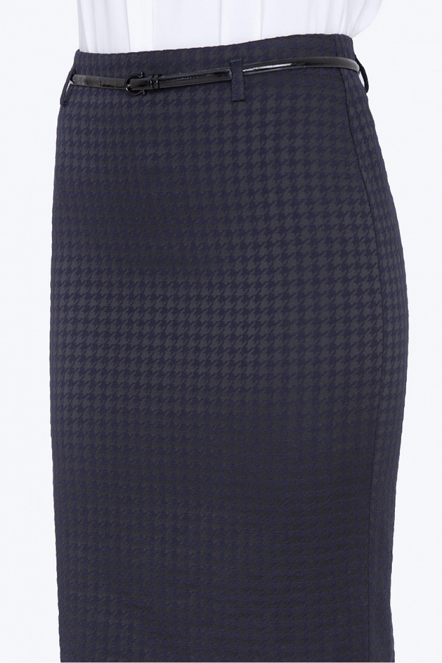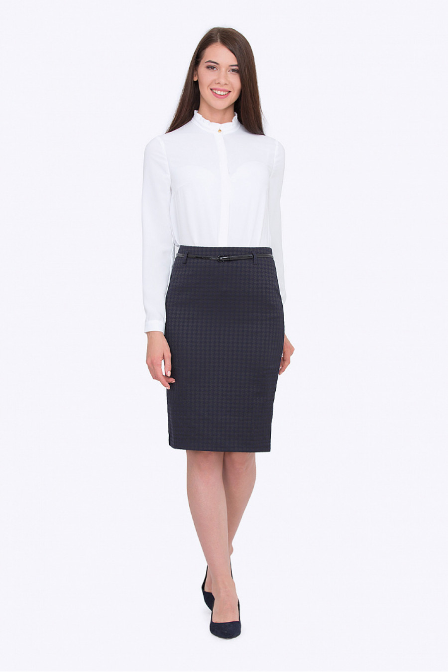 Классическая юбка-карандаш из жаккарда. На поясе есть шлевки, ремешок продается отдельно. Сзади аккуратная шлица. Есть подкладка из полиэстера. Юбка выглядит очень элегантно, благодаря отсутствию лишних деталей. Отличный выбор для офиса. Рост фотомодели 172 см.
