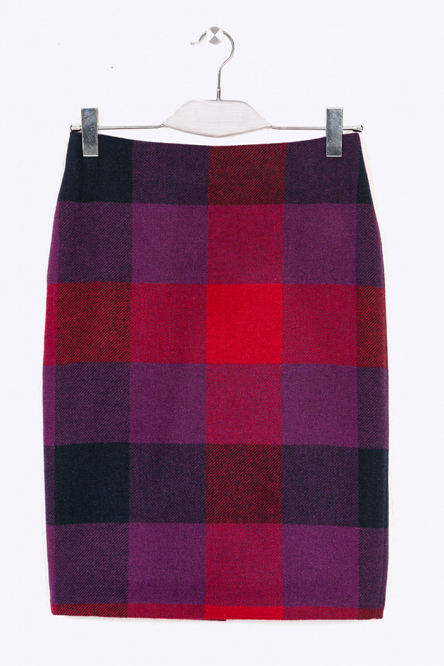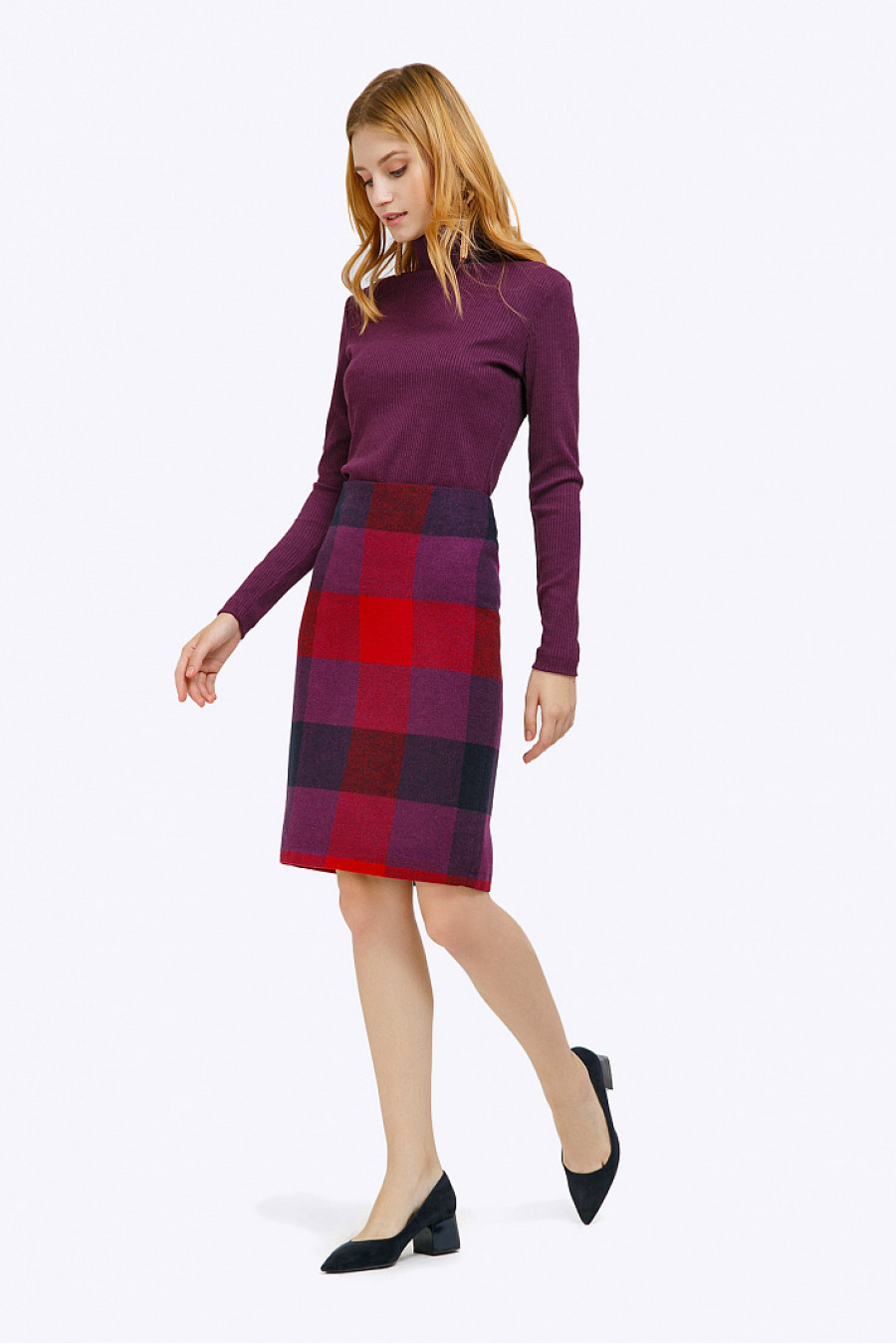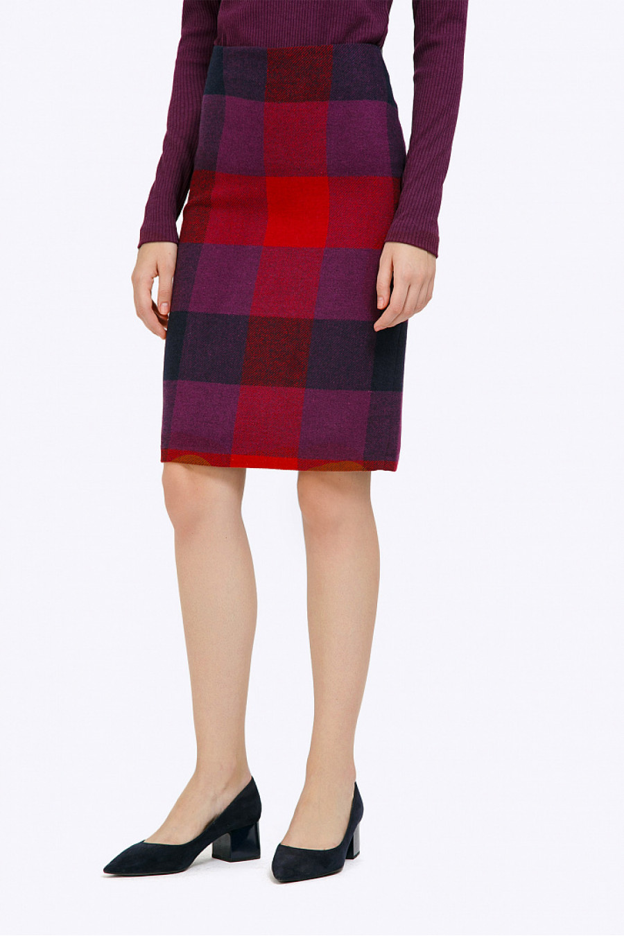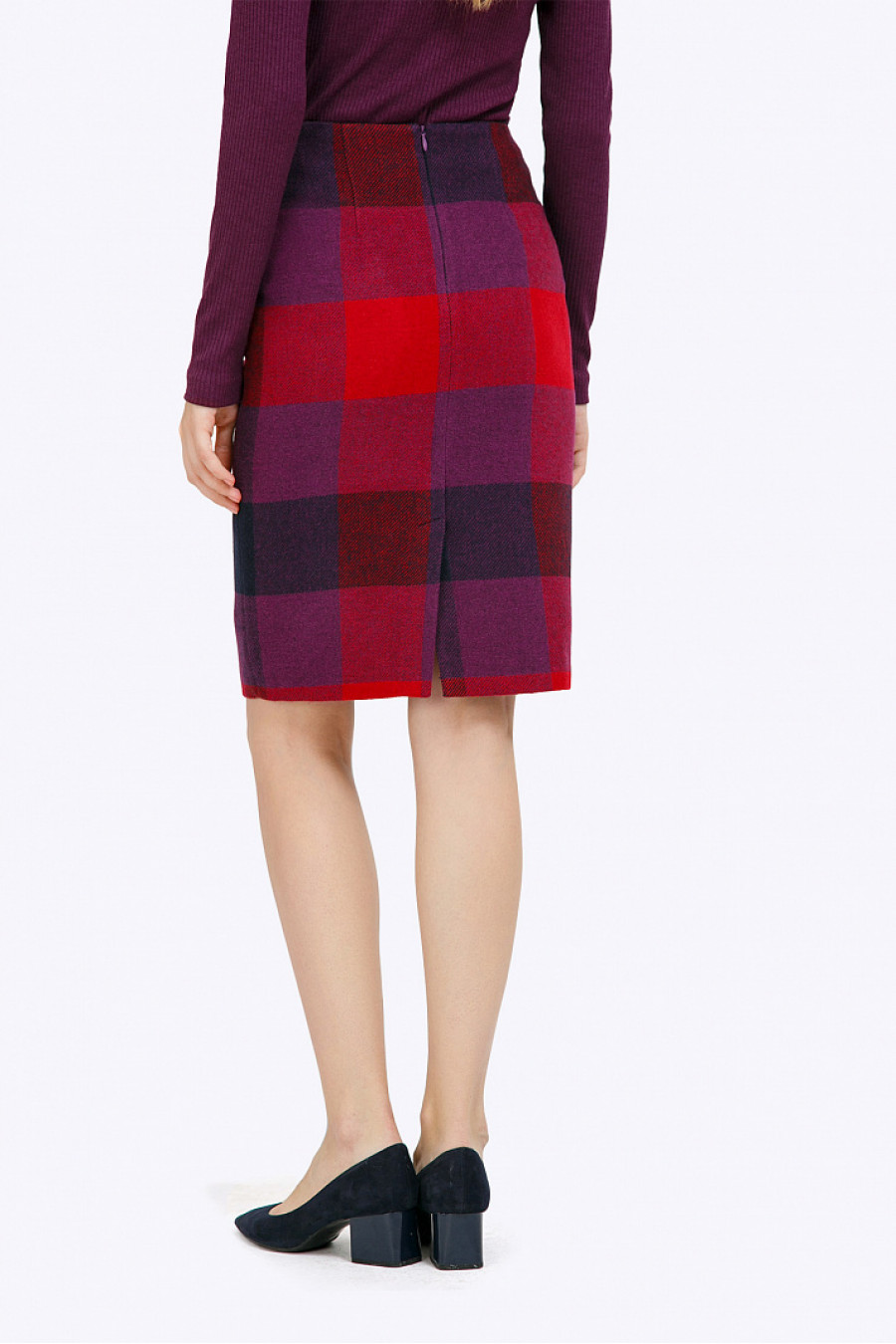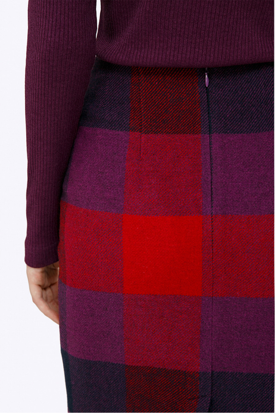 Юбка-миди из чистой шерсти в контрастную крупную клетку, выполненную в насыщенной красно-фиолетовой цветовой гамме. Зауженная модель, без пояса, плотно облегает линию бёдер. На спинке в среднем шве расположены застёжка «молния»и шлица. Рост фотомодели 176 см.