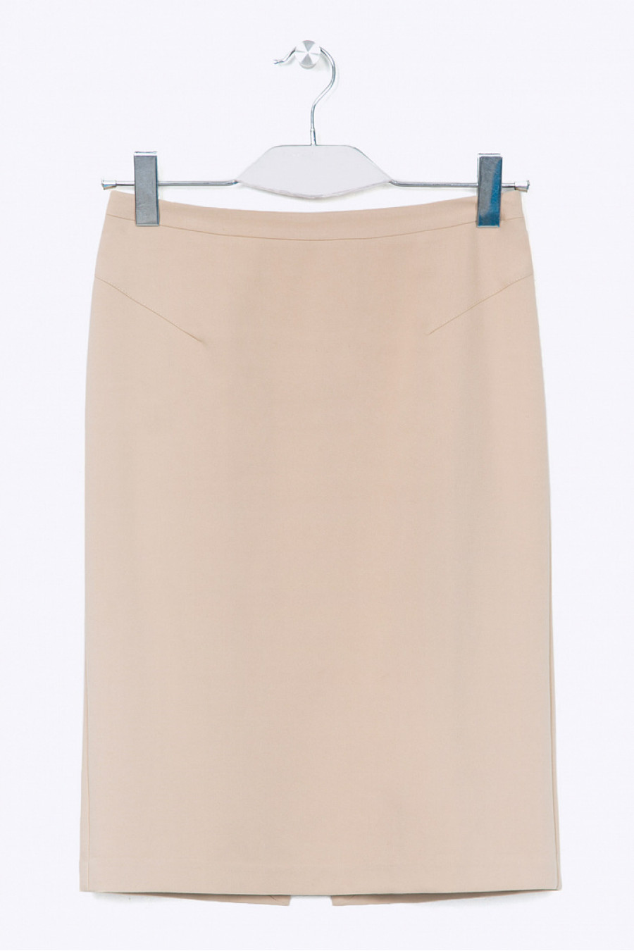 Юбка прямого классического силуэта с застёжкой-молнией и разрезом сзади. Выполнена из качественного костюмного полотна нежного бежевого оттенка. Модель имеет сложный крой, одновременно обеспечивающий безупречную посадку по фигуре и несущий декоративную функцию. Есть подкладка. Образ на фото дополнен блузкой B2306-sansara .Рост фотомодели 177 см.