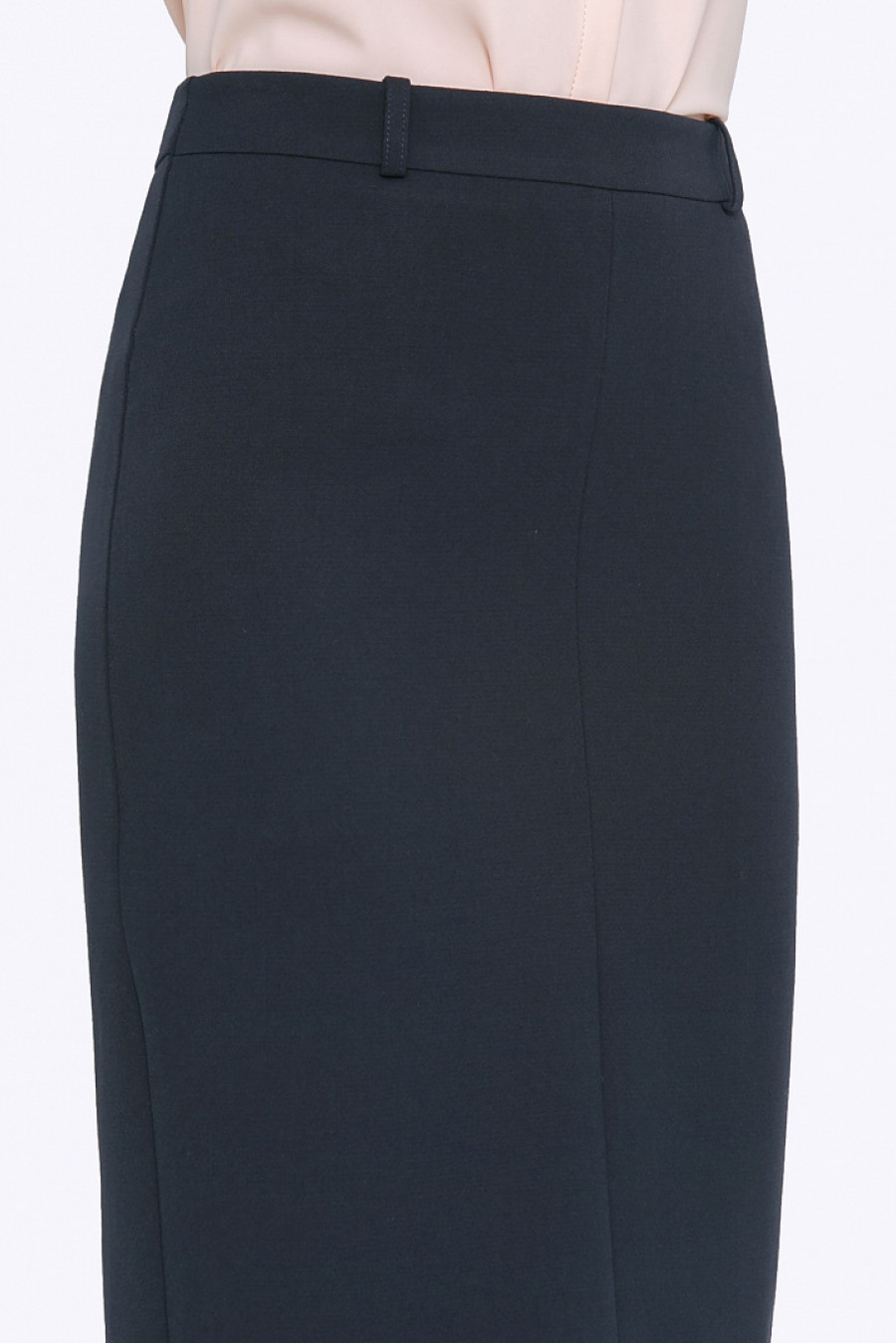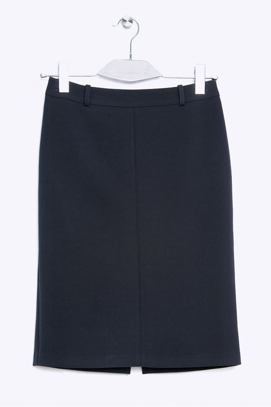Классическая юбка-карандаш. Ткань плотная, эластичная темно-синего цвета. Есть подкладка из полиэстера. Юбка хорошо сидит по фигуре, благодаря плотной ткани скрывает недостатки фигуры. На поясе есть шлевки, ремешок продается отдельно. Сзади - аккуратная шлица. Рост фотомодели 172 см.