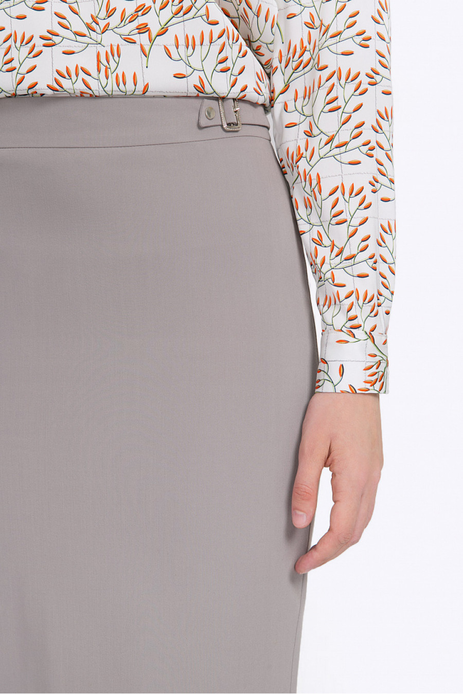 Светло-серая юбка в деловом стиле из немнущейся эластичнойкостюмной ткани. Модель прямого силуэта, средней посадки, плотно облегает линиюбёдер. Пояс по бокам имеет декоративные хлястики с металлической фурнитурой. Сзадирасположены застёжка молния и небольшой разрез, обеспечивающий свободу движения. Рост фотомодели 177 см. Образ на фото дополнен b2324_beila->блузкой B2324-beila .