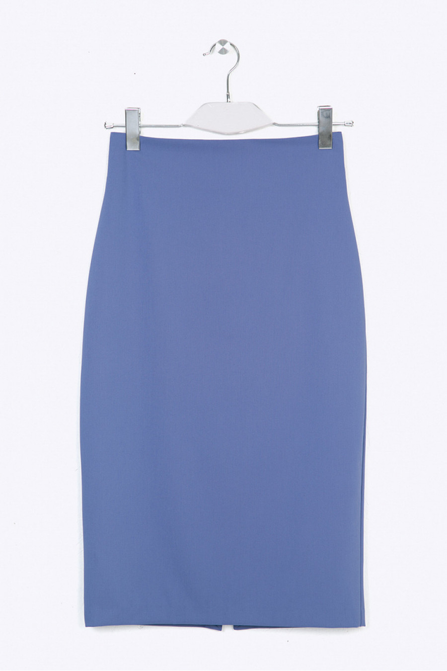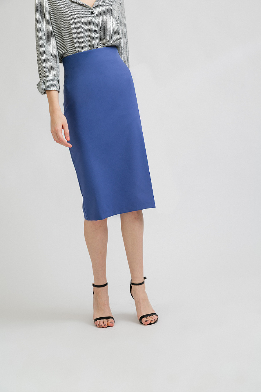 Синяя юбка-карандаш с подкладкой. Выполнена без пояса, плотно облегает линию бёдер. В среднем заднем шве расположены застёжка «молния» и разрез. Рост фотомодели 176см.