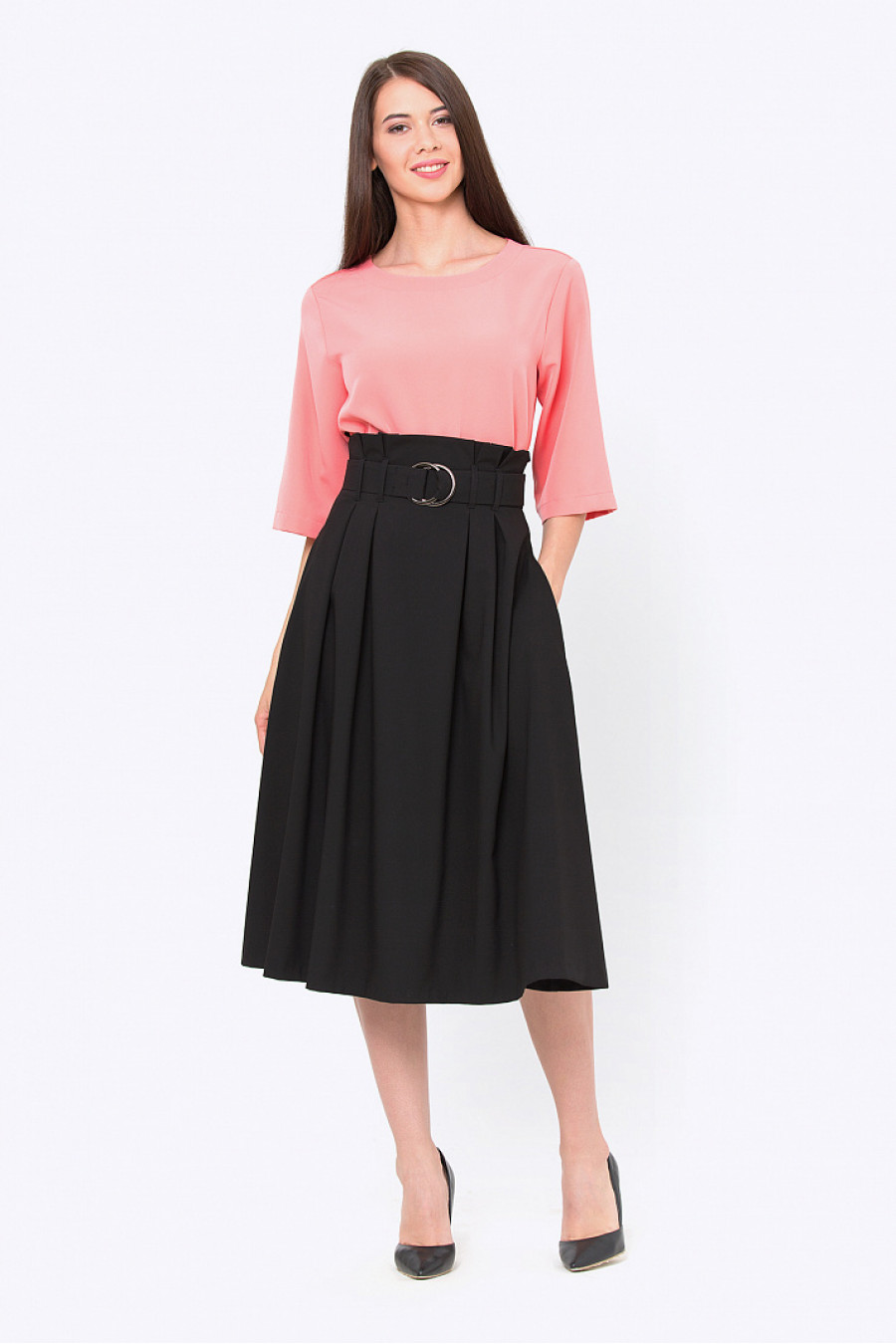 Расклешенная юбка с завышенной талией. Ткань структурная, средней плотности, черного цвета. На талии широкий тканевый пояс. Без подкладки. Юбка хорошо сидит, подойдет как для офиса, так ина каждый день.Рост фотомодели 172 см.
